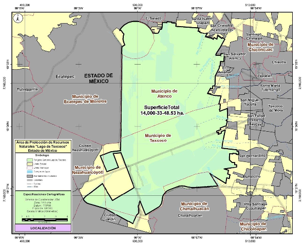 La descripción limítrofe del polígono general que conforma el área de protección de recursos naturales Lago de Texcoco, se encuentra en un sistema de coordenadas proyectadas en Universal Transversa de Mercator (UTM) zona 14 norte, con Elipsoide GRS80 y Datum Horizontal ITRF08 época 2010.0