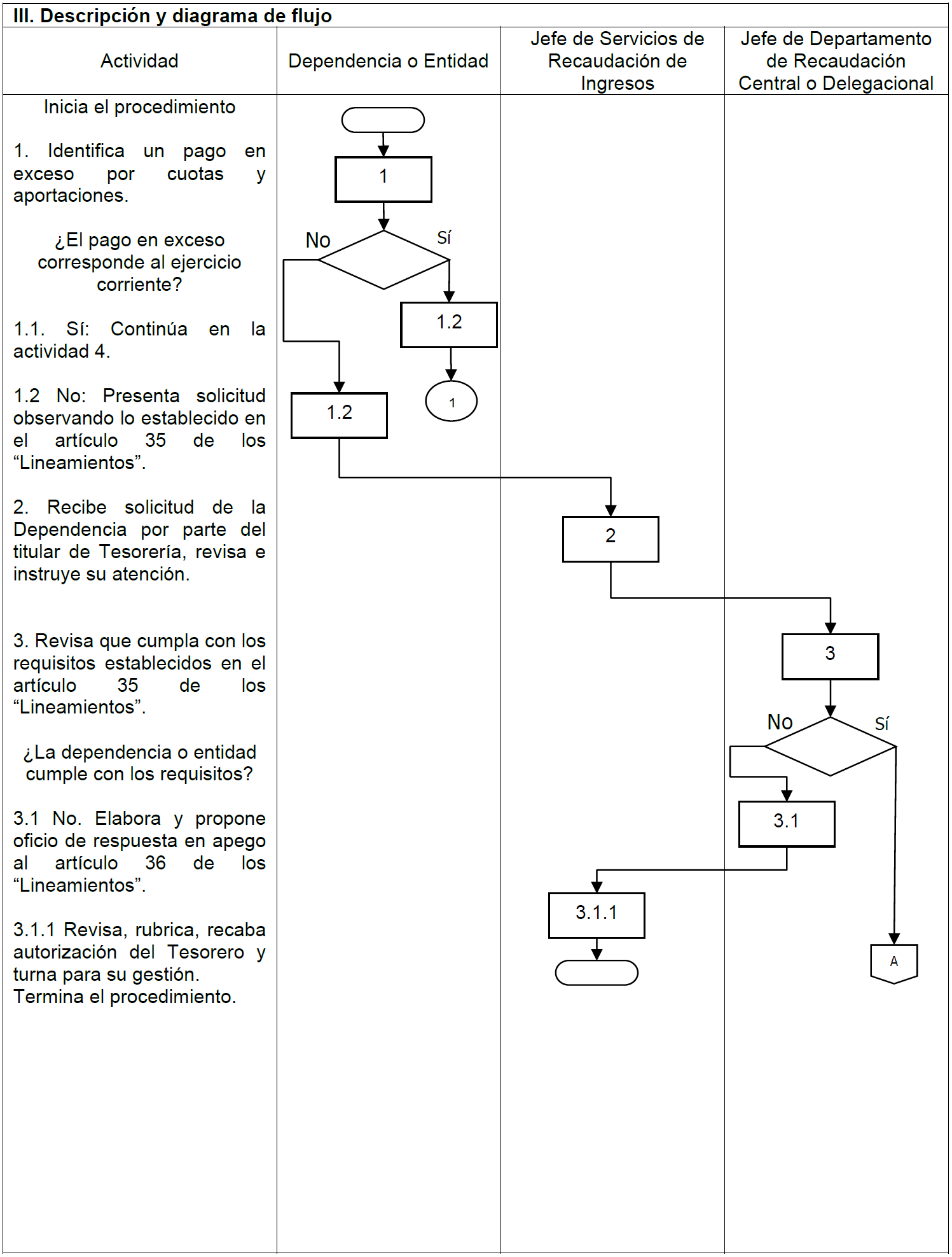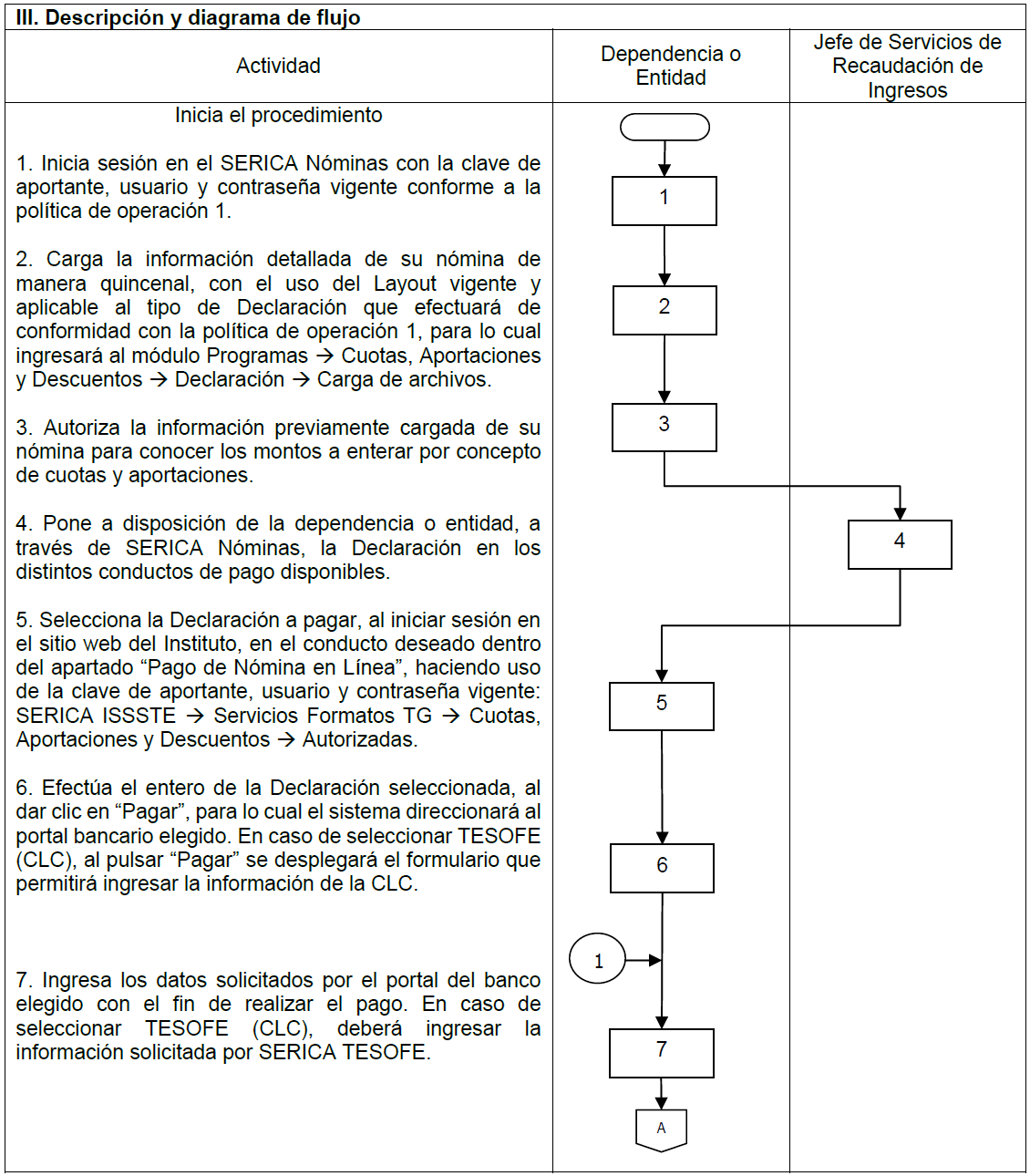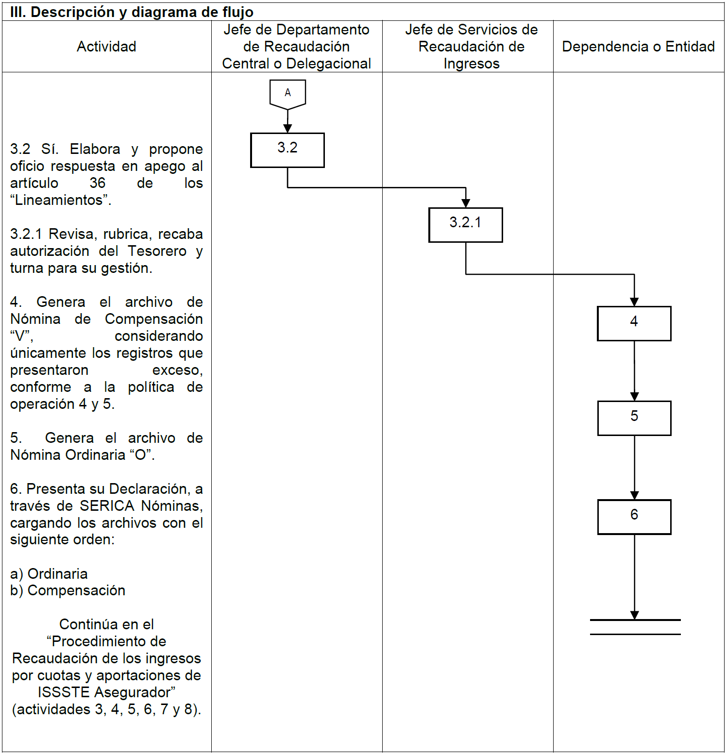 | V. Referencias | Ley del ISSSTE publicada en el Diario Oficial de la Federación, el 31 de marzo de 2007, artículo 26. Estatuto Orgánico del Instituto publicado en el Diario Oficial de la Federación el día 01 de febrero de 2019, artículo 12, fracción III. Manual de Organización General del ISSSTE, publicado en el Diario Oficial de la Federación el día 30 de diciembre de 2010, Tesorería funciones 2 y 17, Jefatura de Servicios de Recaudación de Ingresos funciones 1 y 9; Jefatura de Departamento de Recaudación Central funciones 1 y 11 y Jefatura de Departamento de Recaudación Delegacional funciones 1 y 7. Lineamientos para realizar el entero de cuotas y aportaciones de seguridad social del ISSSTE, publicado en el Diario Oficial de la Federación el día 01 de septiembre de 2021, artículo 4, fracción IV, 33 y 34. |