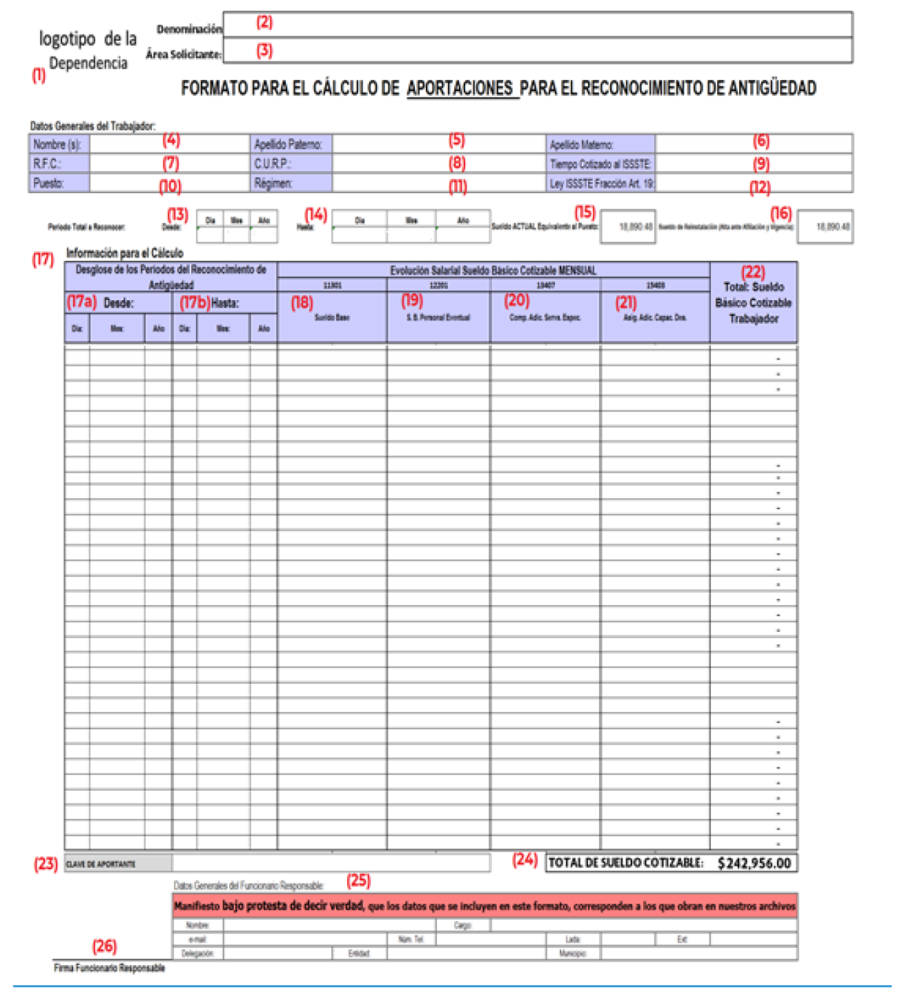 | 17. | Información para el cálculo | En este apartado se deberá señalar el inicio y fin de las fracciones en que se divide el periodo de reconocimiento de antigüedad en función de los cambios salariales, dicho periodo debe coincidir con el señalado en el numeral 13 y 14. Asimismo, no deberán saltarse renglones entre periodos, ni omitir días. | |