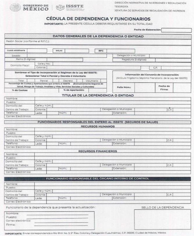 | 12 | Tipo de Incorporación al Régimen de la Ley del ISSSTE. | Deberá marcar con una "X" una de las dos opciones: Decreto o Voluntario |