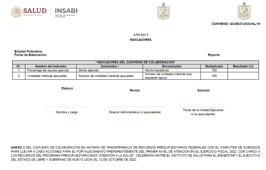 ANEXO 2 DEL CONVENIO DE COLABORACIÓN EN MATERIA DE TRANSFERENCIA DE RECURSOS PRESUPUESTARIOS FEDERALES CON EL CARÁCTER DE SUBSIDIOS PARA LLEVAR A CABO ACCIONES PARA EL FORTALECIMIENTO PREFERENTEMENTE DEL PRIMER NIVEL DE ATENCIÓN EN EL EJERCICIO FISCAL 2022, CON CARGO A LOS RECURSOS DEL PROGRAMA PRESUPUESTARIO E023 "ATENCIÓN A LA SALUD", CELEBRADO ENTRE EL INSTITUTO DE SALUD PARA EL BIENESTAR Y EL EJECUTIVO DEL ESTADO LIBRE Y SOBERANO DE NUEVO LEÓN, EL 12 DE OCTUBRE DE 2022.