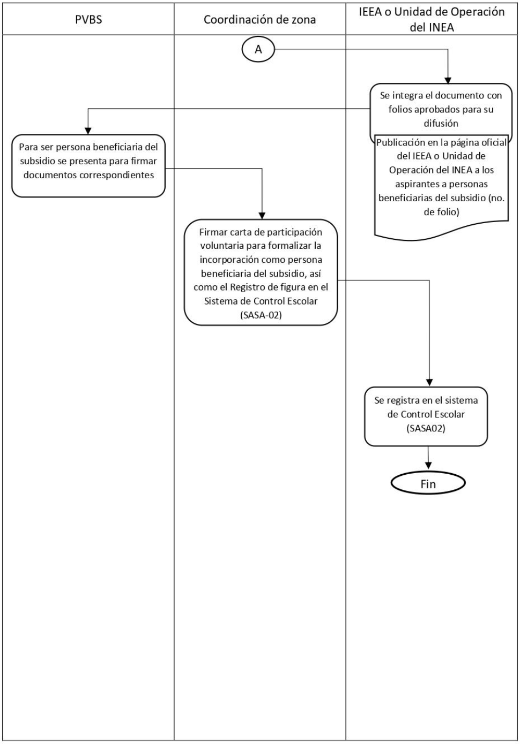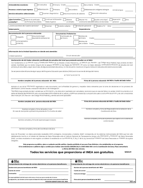 | 1. Recibir e incorporar al expediente, el formato de registro de la persona voluntaria beneficiaria del subsidio (Anexo 10) debidamente firmado y requisitado, así como la carta de participación voluntaria al Programa "Educación para Adultos (INEA)" (Anexo 2), para formalizar su incorporación como persona voluntaria beneficiaria del subsidio. | Los IEEA, UO del INEA y Coordinaciones de zona. | Oficinas del IEEA y/o UO y Coordinaciones de Zona en el estado de...........................ubicadas en .................................................................................................................................................................................... |