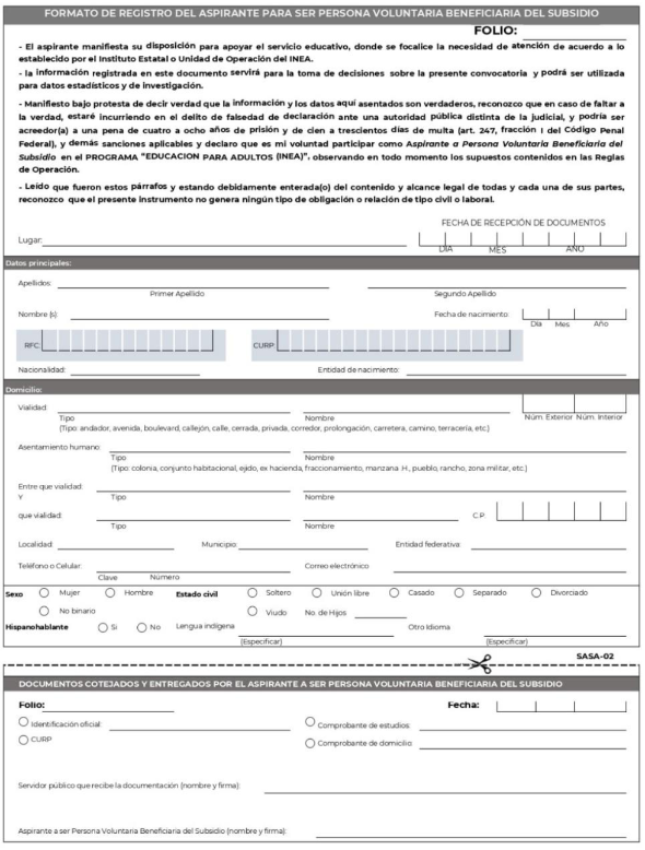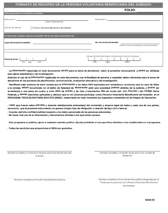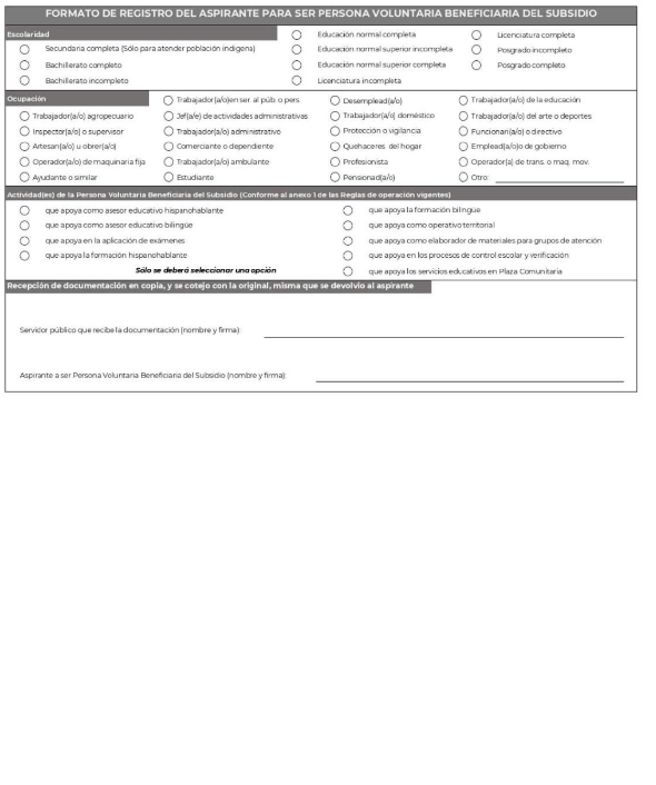 Incorporación de toda persona física que quiera participar como voluntaria beneficiaria del subsidio como apoyo para brindar servicios educativos de alfabetización, primaria y secundaria para personas jóvenes y adultas de 15 años o más, en situación de rezago educativo y que cumpla con los requisitos establecidos en esta convocatoria.