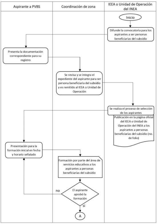 | 1. Se definirá el espacio físico (sedes), y las personas responsables de recibir la documentación de las personas que aspiren a ser personas voluntarias beneficiaras del subsidio, de acuerdo con los periodos y requisitos establecidos en la propia convocatoria. | Los IEEA, UO del INEA en coordinación con el INEA. | |
