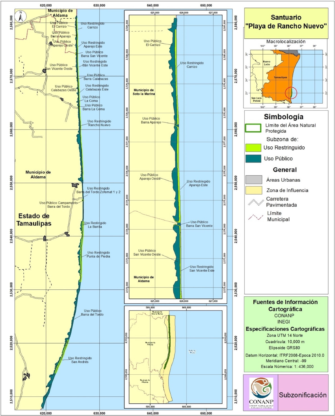 | Uso Restringido | Son aquellas superficies en buen estado de conservación donde se busca mantener las condiciones actuales de los ecosistemas, e incluso mejorarlas en los sitios que así se requieran, y en las que se podrán realizar excepcionalmente actividades de aprovechamiento que no modifiquen los ecosistemas y que se encuentren sujetas a estrictas medidas de control. Esta subzona corresponde a los sitios donde se registra el mayor número del proceso de anidación de tortugas marinas principalmente la especie de tortuga lora (Lepidochelys kempii); así como otras especies de tortugas marinas como la tortuga verde (Chelonia mydas), tortuga caguama (Caretta caretta) y tortuga laúd (Dermochelys coriacea), todas con categoría de en peligro de extinción de acuerdo con la NOM-059-SEMARNAT-2010. Además, cumplen con las condiciones adecuadas para la instalación de corrales de incubación, así como para la protección de nidos in situ. |