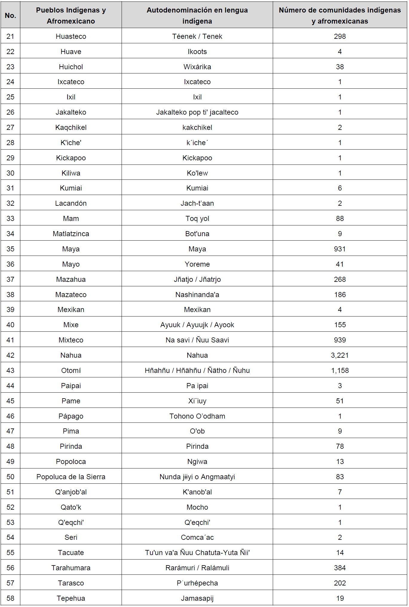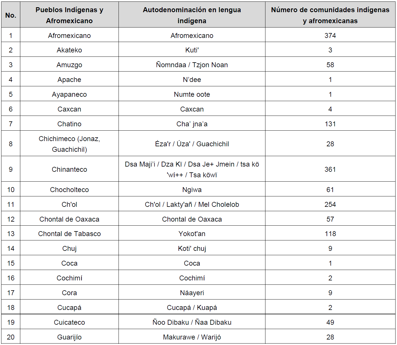 CUARTO. A la fecha de emisión del presente Acuerdo, el Catálogo Nacional de Pueblos y Comunidades Indígenas y Afromexicanas se integra por los siguientes pueblos y número de comunidades: