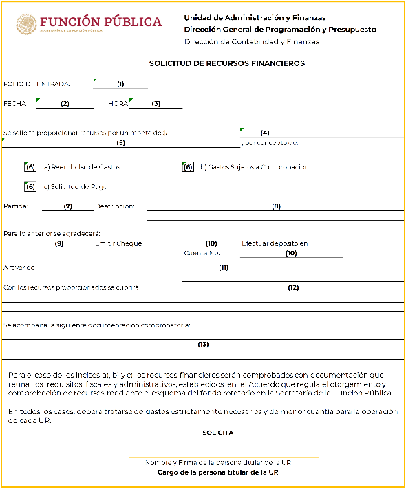 | (13) | Documentación comprobatoria de la Solicitud de Recursos Financieros según sea el caso. |