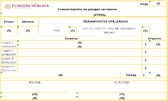 | (12) | Nombre de la persona servidora pública que autoriza la comprobación de los pasajes terrestres locales (Mínimo deberá firmar la persona titular de la Subdirección de Área). |