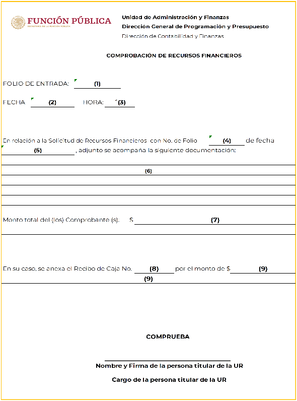 | (1) | Folio de la comprobación de recursos financieros (Lo asigna la DCF). |