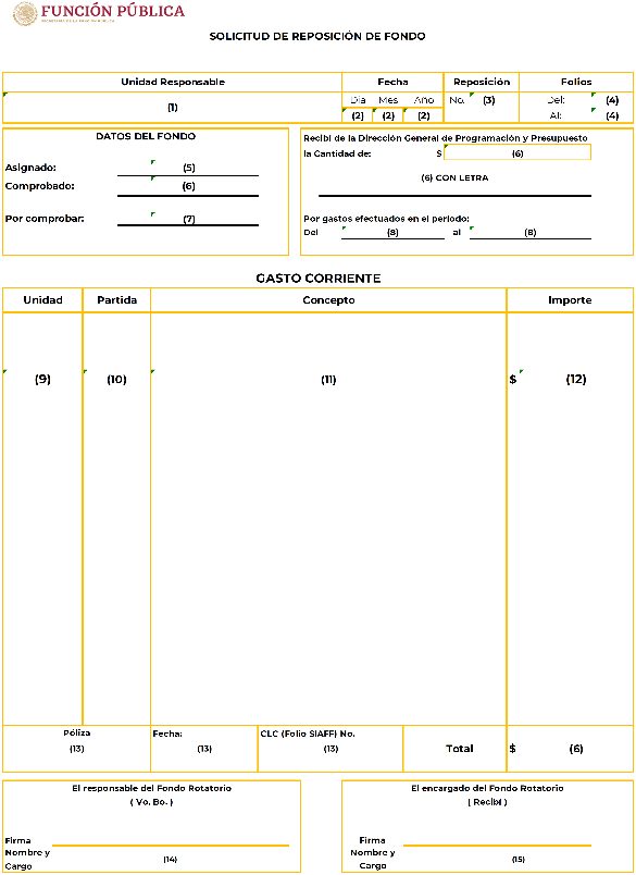| (15) | Nombre, firma y cargo de la persona encargada del fondo rotatorio designado por la persona titular de la UR. |
