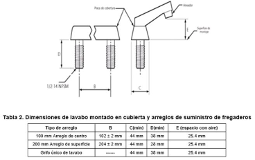 | 258. | 5) Sección 7.2 Conexión Las conexiones de los especímenes deben ser compatibles con las dimensiones de las tuberías (Diámetros, longitudes y roscas), véase tabla 4, y estas pueden ser de rosca, o ensamble a tubo, véase tabla5, o aquellas que se puedan unir por soldadura, adhesión, termo fusión o algún otro método de unión. La referencia de la tabla 4 no es la correcta. Los requisitos están en la tabla 3 y no en la 4. Además, en los siguientes párrafos de la misma sección: En el caso de la grifería para lavabos y fregaderos, las dimensiones para las entradas y la longitud de la conexión de entrada (shank) roscada debe ser de cuerda ½ 14 NPSM como se muestran en las Figuras 1 y 2. Se considera que las mezcladoras para lavabo o fregadero con conectores integrados de medida diferente a ½ -14 NPSM, cumplen, siempre y cuando cuenten con su correspondiente adaptador a ½ -14 NPSM. (Véase figuras 1 y 2, y tablas 2 y 3). Parecen indicar que estos no permiten que las mezcladoras para lavabos y fregaderos tengan otra rosca más que ½ - 14 NPSM, ¿este requisito es solo para aquellos que son montados en la cubierta (deck mounted en inglés)? ¿Serían tan amables de clarificar? | PROCEDE PARCIALMENTE. Con motivo de la revisión del comentario, se observó que con la redacción asentada en el último párrafo del inciso primario "7.2 Conexión", era impreciso, puesto que no abarca a todos los dispositivos que la norma regula; por lo que se modificará la redacción, para quedar: Decía: "7.2 Conexión Las conexiones de los especímenes deben ser compatibles con las dimensiones de las tuberías (diámetros, longitudes y roscas), véase tabla 4, y éstas pueden ser de rosca, o ensamble a tubo, véase tabla 5, o aquellas que se puedan unir por soldadura, adhesión, termo fusión o algún otro método de unión. Las conexiones alternativas con extremos roscados para mangueras flexibles, deben apegarse a los requerimientos de esta norma. En el caso de la grifería para lavabos y fregaderos, las dimensiones para las entradas y la longitud de la conexión de entrada (shank) roscada debe ser de cuerda ½ - 14 NPSM como se muestran en las Figuras 1 y 2. Se considera que las mezcladoras para lavabo o fregadero con conectores integrados de medida diferente a ½-14 NPSM, cumplen, siempre y cuando cuenten con su correspondiente adaptador a ½-14 NPSM. (Véase figuras 1 y 2, y tablas 2 y 3)". Dice: "7.2 Conexión. (...) Se considera que los grifos para lavabo o fregadero con conectores integrados de medida diferente a ½ -14 NPSM, cumplen, siempre y cuando cuenten con su correspondiente adaptador a ½ -14 NPSM (Véase Figuras 1 y 2, y Tablas 2 y 3)." Con fundamento en el artículo 33, tercer párrafo del Reglamento de la Ley Federal sobre Metrología y Normalización, se consideró que no era procedente hacer referencia a la "Tabla 3" en el inciso primario "7.2 Conexión", como fue propuesto, debido a que de hacerlo, se estaría limitando el párrafo a las conexiones con mangueras, cuando la finalidad es abarcar también a las de tubo. Este comentario guarda relación con los diversos 80, 133, 162, y 269 |