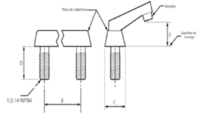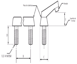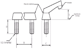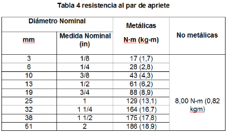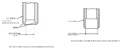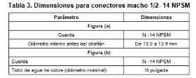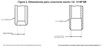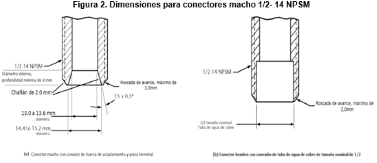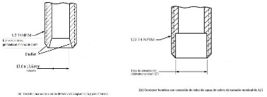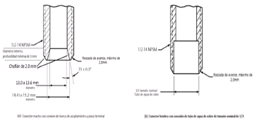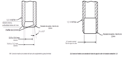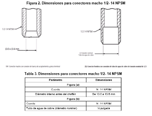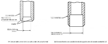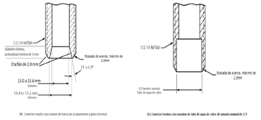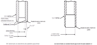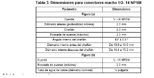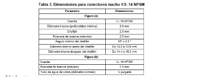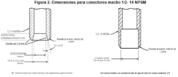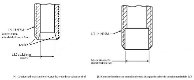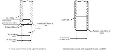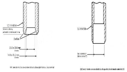 | 269. | PROY-NOM-012-CONAGUA-2015: 7.2 Conexión Las conexiones de los especímenes deben ser compatibles con las dimensiones de las tuberías (diámetros, longitudes y roscas), véase tabla 4, y éstas pueden ser de rosca, o ensamble a tubo, véase tabla 5, o aquellas que se puedan unir por soldadura, adhesión, termo fusión o algún otro método de unión Las conexiones alternativas con extremos roscados para mangueras flexibles, deben apegarse a los requerimientos de esta norma. En el caso de la grifería para lavabos y fregaderos, las dimensiones para las entradas y la longitud de la conexión de entrada (shank) roscada debe ser de cuerda ½ - 14 NPSM como se muestran en las Figuras 1 y 2. Se considera que las mezcladoras para lavabo o fregadero con conectores integrados de medida diferente a ½-14 NPSM, cumplen, siempre y cuando cuenten con su correspondiente adaptador a ½-14 NPSM. (Véase figuras 1 y 2, y tablas 2 y 3). 7.2.1.2 Procedimiento a. Las superficies internas y externas, así como la cuerda de conexión deben de estar limpias, en caso de que éstas presentan algún tipo de impureza, limpiar la cuerda. b. Acoplar manualmente el calibrador maestro de roscas a la conexión, hasta lograr un apriete manual. c. Para rosca NPT apretar hasta que el calibrador llegue a tope, registrar si existe variación (en números de hilos) con respecto a la marca del calibrador. d. Para roscas NPSM roscar el calibrador PASA hasta el tope de la rosca, después el calibrador NO PASA. e. El ensayo se considera satisfactorio si al finalizar se obtiene alguno de los resultados señalados en el apartado siguiente. 7.2.1.3 Resultado Se considera que el espécimen cumple, siempre que se observe lo indicado a continuación: a. Para rosca NPT no existe una variación de ± un hilo. b. Para roscas NPSM el calibrador PASA entra sin problemas en toda la rosca y el calibrador NO PASA no rosca. Se deberá informar el tipo de cuerda y el número de hilo que se penetran en la conexión. 7.3 Fuerza mínima para abrir, operar y cerrar un espécimen