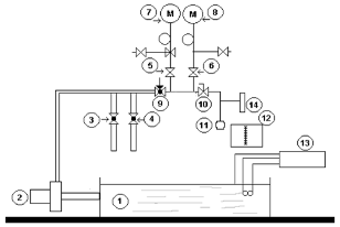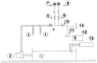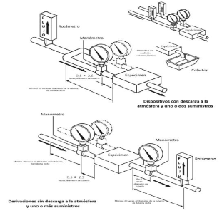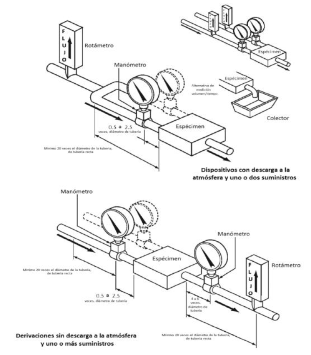 | | 7.7.2.2 Equipo a) Manómetro (s). b) Cronómetro. c) Sistema de suministro de agua que incremente la presión hidrostática al menos hasta 3 450 kPa (35 kg/cm2) y mantenerla por un minuto. 7.7.2.3 Procedimiento para accesorios Éstos deben soportar una presión hidrostática de 3 450 kPa por un lapso de un minuto. La presión debe aplicarse en el interior, cuando la o las válvula(s) estén cerradas. Algunos tipos de accesorios pueden ser de alivio, el cual debe de poder aliviar la presión, si ésta es superior a los 1030 kPa. 7.7.2.4 Procedimiento para grifos y válvulas Los grifos y válvulas deben soportar una presión de 3 450 kPa por un lapso de un minuto. La presión debe ser aplicada en el interior, dejando cerradas las salidas y la válvula abierta. 7.7.2.5 Resultado Se considera que el espécimen cumple, si al finalizar el ensayo soporta la presión hidrostática de ruptura sin presentar daños permanentes, o no existe caída de presión durante el mismo. 7.7.3 Conjunto de mangueras 7.7.3.1 Requerimiento El espécimen debe soportar la presión hidrostática de 686 kPa (7 kg/cm2) durante al menos una hora, sin presentar daños permanentes o caída de presión. Además debe soportar la presión hidrostática 1 961kPa (20 kg/cm2) durante un minuto, sin presentar daños permanentes o falla en la presión. El conjunto de mangueras debe ser probado según lo indicado en los apartados 7.7.3.2 y 7.7.3.4. 7.7.3.2 Torque El conjunto de mangueras y conexiones roscadas, deben probarse como se describe en el apartado 7.7.3.4. Las conexiones roscadas apretadas para: a) El torque requerido para afectar el sello (se toma lectura de ello); y b) 50% más del torque requerido en el inciso a). A la lectura tomada en el inciso a), se le incrementa un 50% más de torque. 7.7.3.3 Equipo a) Manómetro (s). b) Cronómetro c) Sistema de suministro de agua que permita incrementar la presión hidrostática hasta 1 961kPa (20 kg/cm2) por un minuto y 686 kPa (7 kg/cm2) mantenerla por una hora. 7.7.3.4 Procedimiento para la presión de ruptura El conjunto de mangueras debe ser probado con una presión hidrostática de 686 kPa (7 kg/cm2) durante el lapso de una hora, después someterlo a una prueba de presión de ruptura de 1 961kPa (20 kg/cm2) durante un minuto, utilizando agua a temperatura ambiente. Se permiten caídas en la presión y recuperación de ésta, de acuerdo a lo indicado en la figura 5. 7.7.3.5 Resultado Se considera que el espécimen cumple si al finalizar el ensayo soporta lo indicado en el apartado 7.7.3.1. PROPUESTA DE AMEXVAL 6. Resistencia a la presión hidrostática, temperatura y hermeticidad (sic) Las válvulas o grifos para: Lavabo Fregadero Regadera Jardín. No deben presentar fugas ni deformaciones al someterlas a una presión hidrostática de Baja 294,20 kPa (3,00 kgf/cm2) Media 588,40 kPa (6,00 kgf/cm2) Alta 882,60 kPa (9,00 kgf/cm2 Durante 30 min y, a una temperatura de 343 K ± 5 K(70 ºC ± 5 ºC) Para las válvulas de llenado de tinaco o cisterna no deben presentar fugas ni deformaciones al someterlas a una presión de 588,40 kPa (6 kgf/cm2). Esto debe verificarse de acuerdo al método de ensayo establecido en el punto 8,6 8,6. Resistencia a la presión hidrostática, temperatura y hermeticidad Equipo - Equipo para ensayos hidráulicos o similar ver Apéndice B. figura 2 - Manómetro con exactitud mínima del 2%. - Cronómetro - Termómetro con graduación mínima de 1° C. Preparación de la muestra Las válvulas y grifos deben de estar limpios Procedimiento Ajustar el equipo de ensayo de acuerdo al APENDICE NORMATIVO A Instalar la válvula o grifo y cerrar la válvula 10 Ajustar la presión hidráulica de acuerdo a lo indicado en el instructivo Elevar la temperatura del agua de ensayo a 343 K ± 5 K (70 °C ± 5 °C) Abrir la válvula 10 y dejar durante 30 minutos Para válvulas o grifos que trabajen a varias presiones, el ensayo se realizará únicamente a la máxima Resultados Las válvulas o grifos no deben presentar fugas o deformaciones al término del ensayo | | ||||||||||||||||||||||||||||||||||||||||||||||||||||||||||||||||||||||||||||||||||||||||||||||||||||||||||||||||||||||||||||||||||||||||||||||||||||||||||||||||||||||||||||||||||||||||||||||||||||||||||||||||||||||||||||||||||||||||||