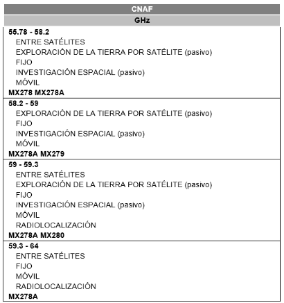 Tabla 1. Atribución de la banda 57-64 GHz de acuerdo con el CNAF vigente.