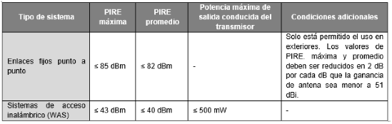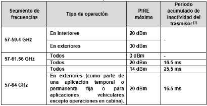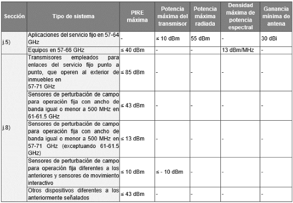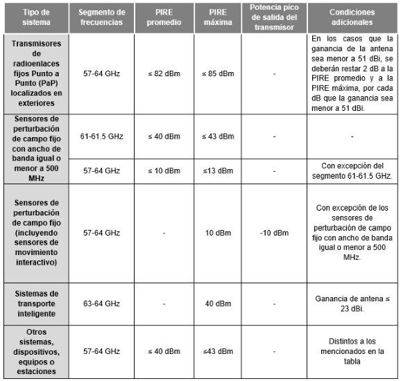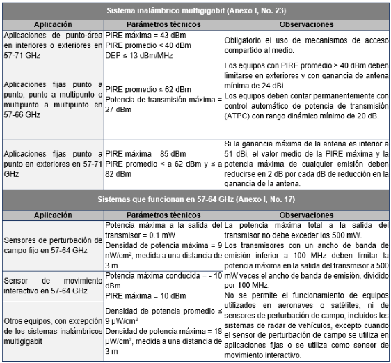 Adicionalmente a los parámetros y condiciones establecidos actualmente para los diferentes tipos de sistemas en la banda 57-64 GHz, el Anexo 1 también establece que: