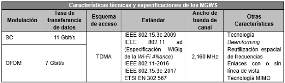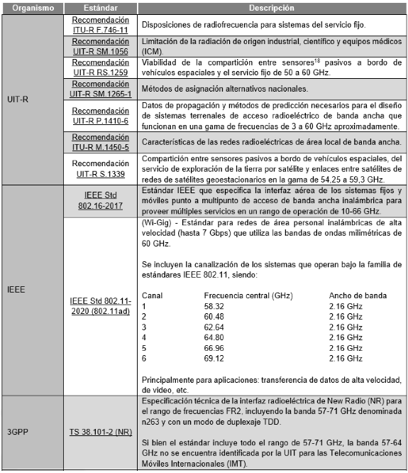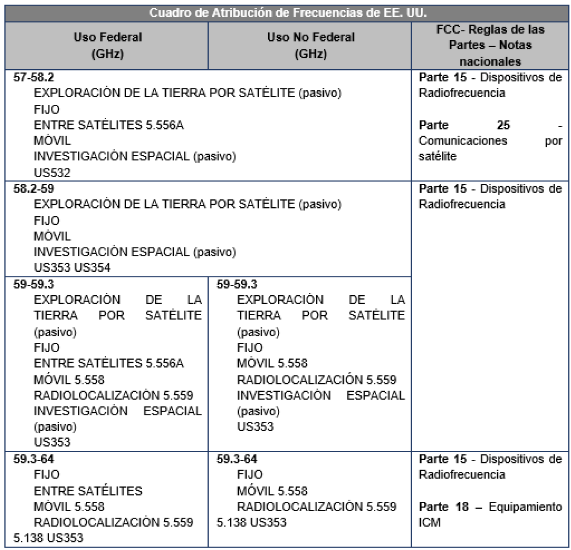 Específicamente, la banda de frecuencias 57-64 GHz (banda 57-64 GHz) ha sido adoptada y comercializada a nivel nacional e internacional para diversas aplicaciones que hacen uso del espectro radioeléctrico en ambientes interiores y exteriores, incluyendo sistemas de comunicaciones punto a punto fijos y punto a multipunto de alta velocidad de datos, sistemas fijos de detección de objetos y seguimiento de movimiento (p. ej. sensores de perturbación de campo fijos), dispositivos de radiocomunicación de corto alcance (DRCA), sistemas de acceso inalámbrico de múltiples gigabits (MGWS) y de baja latencia, tales como Wi-Gig y otras aplicaciones de redes inalámbricas de área local (WLAN), así como dispositivos destinados a aplicaciones industriales, científicas y médicas (ICM), entre otros, los cuales han operado de forma compartida en la banda 57-64 GHz.