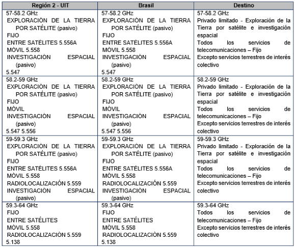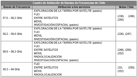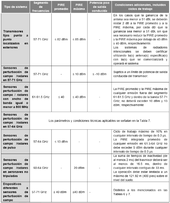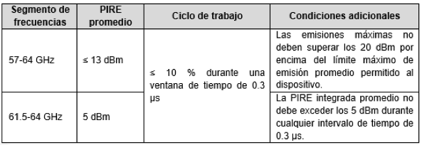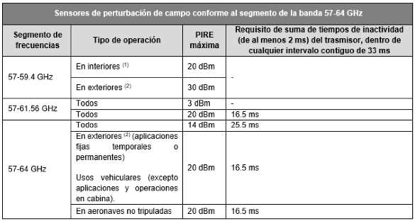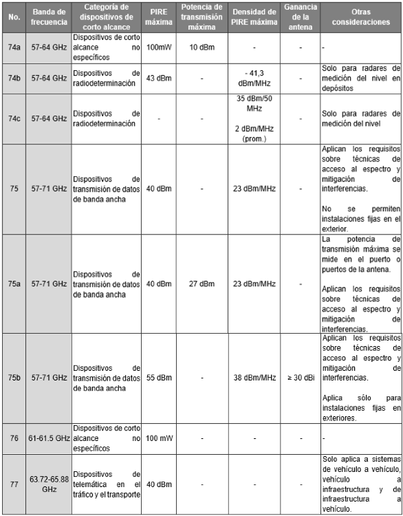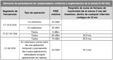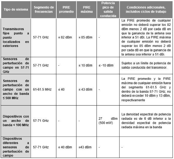Finalmente, quedaron prohibidas las operaciones en la banda 57-64 GHz de sistemas, dispositivos, equipos o estaciones utilizados en aeronaves o satélites, así como los sensores de perturbación de campo, incluyendo los radares vehiculares, excepto que dichos sensores sean empleados para operaciones fijas o como dispositivos de corto alcance para detección de movimiento interactivo.