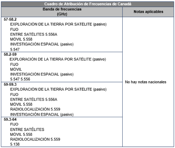 MX280 La banda de frecuencias 59 - 59.3 GHz se encuentra atribuida a título primario al servicio de exploración de la Tierra por satélite. En virtud de que dicho servicio se considera relacionado con la seguridad de la vida humana, esta banda de frecuencias se clasifica como espectro protegido. La utilización de esta banda de frecuencias por los servicios fijo, móvil, investigación espacial, radiolocalización y entre satélites no deberá causar interferencias perjudiciales a la operación del servicio de exploración de la Tierra por satélite, ni deberá reclamar protección contra interferencias perjudiciales provenientes de dicho servicio."