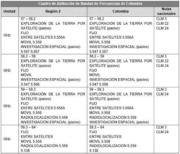 En el ámbito regulatorio nacional, el CNAF es la disposición administrativa que indica el servicio o los servicios de radiocomunicaciones a los que se encuentra atribuida una determinada banda de frecuencias del espectro radioeléctrico, así como información adicional sobre el uso y planificación de determinadas bandas de frecuencias(5). La Tabla 1 muestra la atribución nacional actual conforme al CNAF para la banda 57-64 GHz.