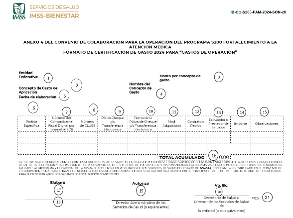 | 9 | Póliza Cheque y/o Transferencia Electrónica del pago efectuado | | 20 | Titular de la Secretaría de Salud Estatal o Titular de los Servicios de Salud de la Entidad Federativa (o su equivalente) |
