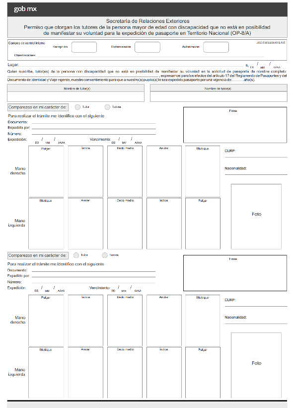 | III. | Permiso que otorgan los tutores de la persona mayor de edad con discapacidad que no está en posibilidad de manifestar su voluntad para la expedición de pasaporte en Territorio Nacional (OP-8/A); | SRE-03-008-A SRE-03-009-A |