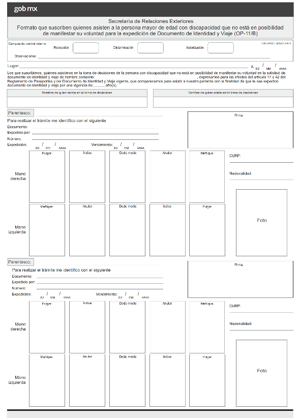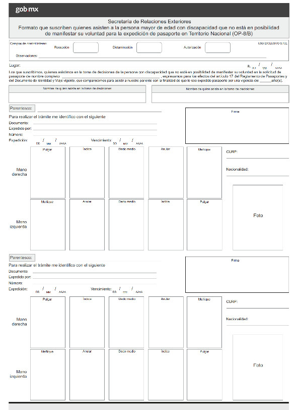 | IV. | Formato que suscriben quienes asisten a la persona mayor de edad con discapacidad que no está en posibilidad de manifestar su voluntad para la expedición de pasaporte en Territorio Nacional (OP-8/B); | SRE-03-008-B SRE-03-009-B |