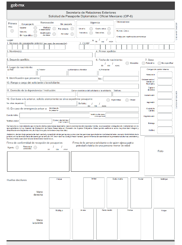 | I. | Solicitud de Pasaporte Diplomático/Oficial Mexicano (OP-6); | SRE-03-015 SRE-03-016 |