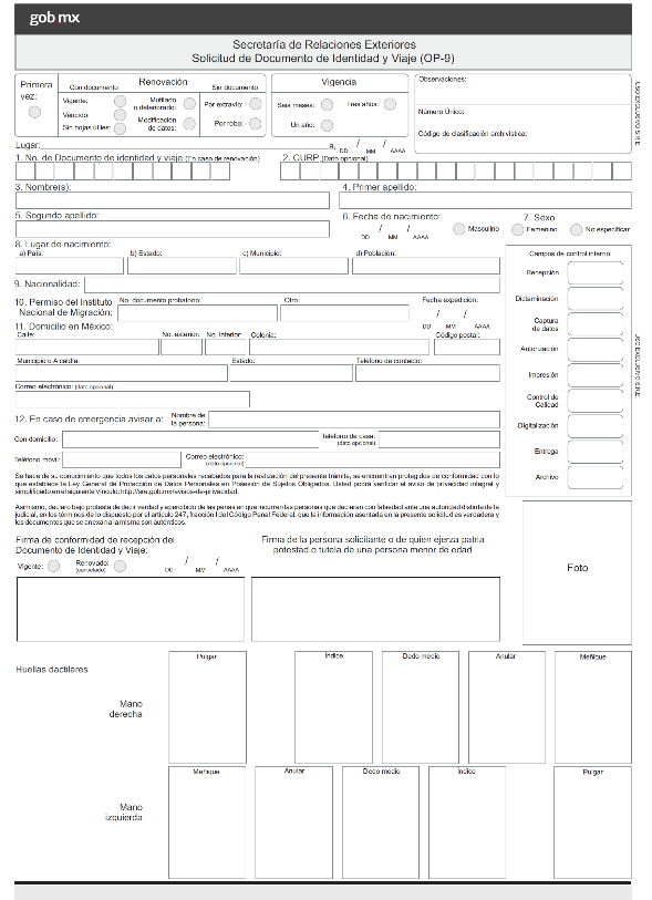 | V. | Solicitud de Documento de Identidad y Viaje (OP-9); | SRE-03-010 SRE-03-011-A SRE-03-011-B SRE-03-011-C SRE-03-011-D SRE-03-012-A SRE-03-012-B |