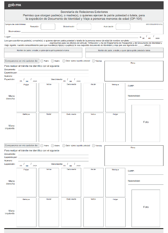 | VI. | Permiso que otorgan padre (s), o madre (s), o quienes ejercen la patria potestad o tutela, para la expedición de Documento de Identidad y Viaje a personas menores de edad (OP-10/I); | SRE-03-011-A SRE-03-011-B SRE-03-011-C SRE-03-011-D SRE-03-012-A SRE-03-012-B |