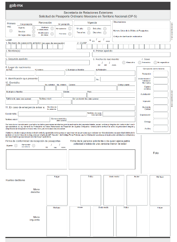 | I. | Solicitud de Pasaporte Ordinario Mexicano en Territorio Nacional (OP-5); | SRE-03-002 SRE-03-003 SRE-03-004 SRE-03-005 SRE-03-006-A SRE-03-006-B SRE-03-006-C SRE-03-006-D SRE-03-007-A SRE-03-007-B SRE-03-007-C SRE-03-007-D SRE-03-008-A SRE-03-008-B SRE-03-009-A SRE-03-009-B |