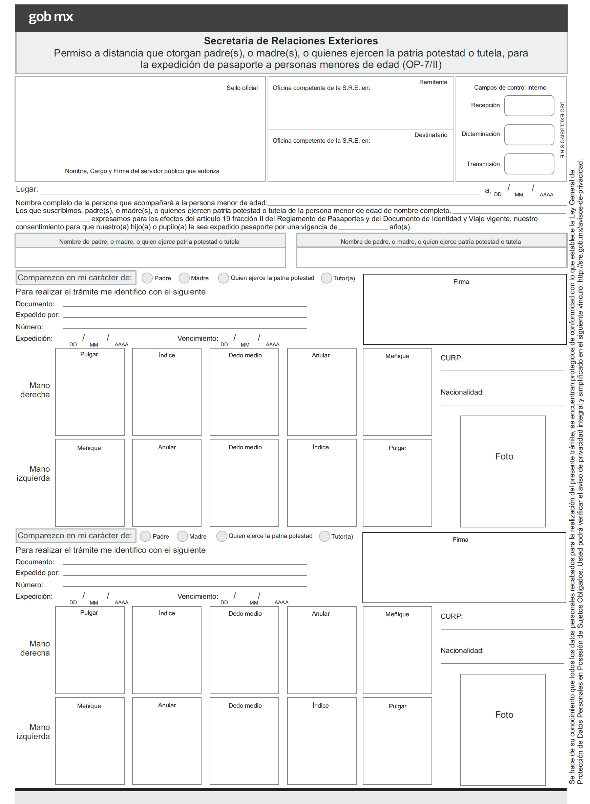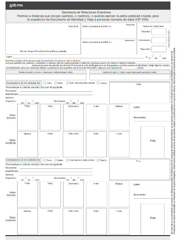 | VII. | Permiso a distancia que otorgan padre (s), o madre (s), o quienes ejercen la patria potestad o tutela, para la expedición de Documento de Identidad y Viaje a personas menores de edad (OP-10/II); | SRE-03-011-B SRE-03-012-B |