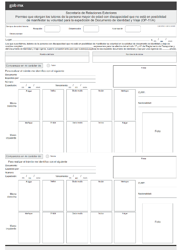 | VIII. | Permiso que otorgan los tutores de la persona mayor de edad con discapacidad que no está en posibilidad de manifestar su voluntad para la expedición de Documento de Identidad y Viaje (OP-11/A), y | SRE-03-012-A |