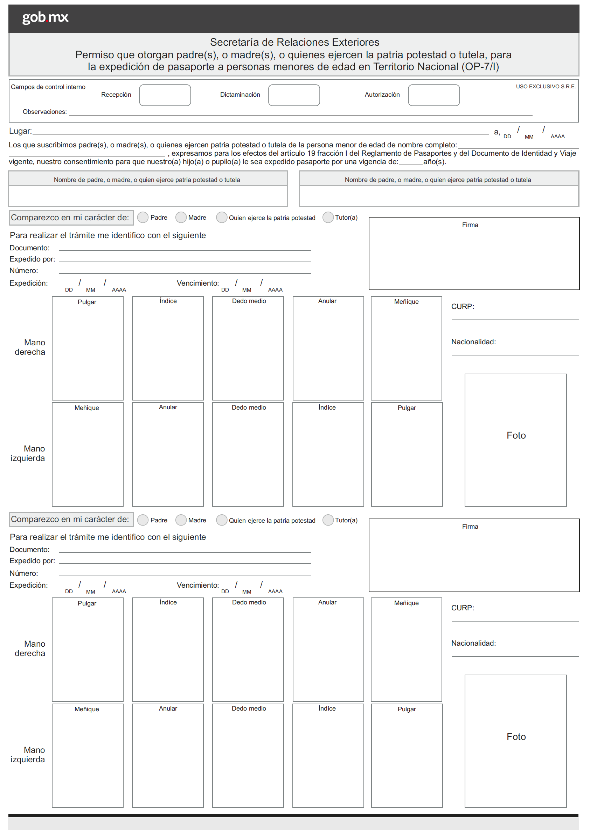 | II. | Permiso que otorgan padre (s), o madre (s), o quienes ejercen la patria potestad o tutela, para la expedición de pasaporte a personas menores de edad en Territorio Nacional (OP-7/I); | SRE-03-004 SRE-03-005 SRE-03-006-A SRE-03-006-B SRE-03-006-C SRE-03-006-D SRE-03-007-A SRE-03-007-B SRE-03-007-C SRE-03-007-D SRE-03-008-A SRE-03-008-B SRE-03-009-A SRE-03-009-B |