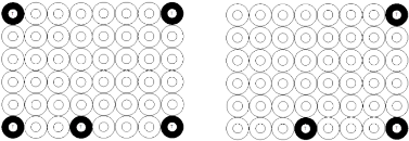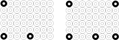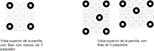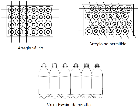 E.2.5 Las botellas de PET deben ser colocadas de manera que formen filas sin traslape y centradas en área de la parrilla. La suma del espacio libre por cada lado de la parrilla no debe permitir el acomodo de otra botella como se ejemplifica en el arreglo válido, véase la Figura E.1.