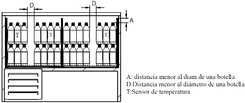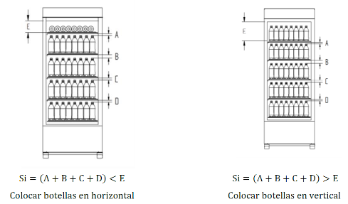 E.3.1 La carga del aparato se debe hacer botella por botella o paquete de seis, colocándolas en forma vertical como se indica en la siguiente Figura, las botellas deben colocarse pegadas a las parrillas y llenar el enfriador al máximo de su capacidad considerando el nivel de carga, si lo especifica el fabricante. El único espacio permitido en el enfriador es el que se encuentra entre la pared de éste y las botellas, siendo este espacio menor al diámetro de una botella.