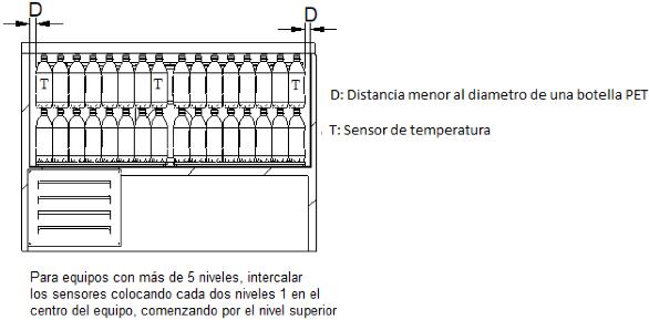 E.4.2 Los sensores deben ser colocados en botellas de las columnas adyacentes a aquellas que están en contacto con las placas frías y solamente en la parte superior, como se ejemplifica en las figuras anteriores y en las figuras E.15.