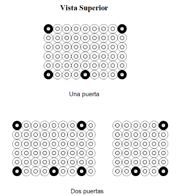 E.2.10 El número de sensores que debe tener cada nivel de parrillas y la colocación de los mismos, para enfriadores verticales de una, dos y tres puertas, véase las Figuras E.5 y E.6.