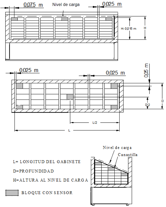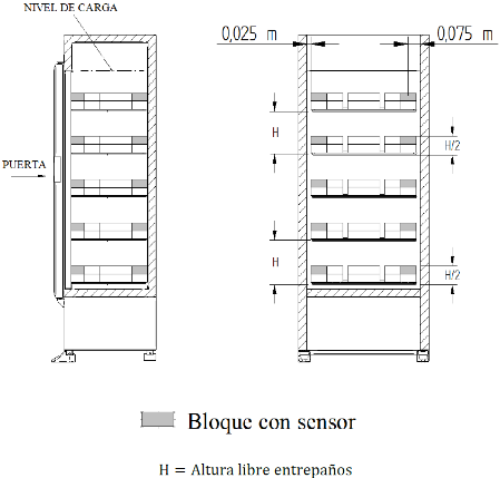 E.7.2 La columna de bloques de prueba debe estar separada 0,025 m ± 0,005 m de la pared del gabinete y de igual manera para la separación de cada columna de bloques de prueba. Se deben colocar cinco bloques con sensor en la fila superior cercanos al nivel de carga de cada entrepaño y uno de los sensores debe ser colocado en el centro geométrico del entrepaño de la vitrina, como se ejemplifica en la Figura E.18; si la vitrina incluye cualquier tipo de estructura en su centro, el sensor puede ser colocado a la derecha, a la izquierda, al frente o atrás de tal estructura separado 0,025 m.