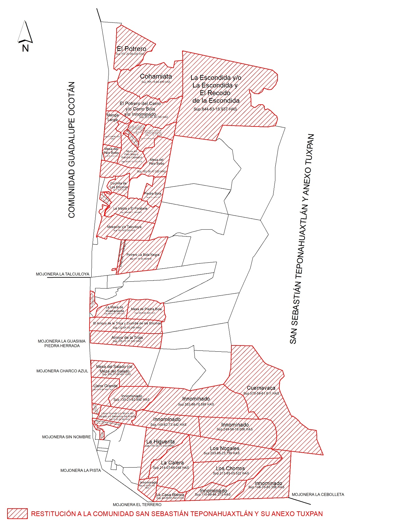 Que, la Comunidad de San Sebastián Teponahuaxtlán y su anexo Tuxpan se vieron obligados a instaurar juicios ante el Tribunal Unitario Agrario 16 a efecto de obtener la certeza jurídica de sus tierras, de lo que se derivaron 31 juicios con número de expedientes: JA 1472/16/2012, JA 769/2012, JA 990/16/2012, JA 992/16/2012, JA 1448/16/2012, JA 1449/2012, JA 54/2022-16, JA 55/2022-16, JA 56/2022-16, JA 57/2022-16, JA 58/2022-16, JA 59/2022-16, JA 60/2022-16, JA 61/2022-16, JA 62/2022-16, JA 249/2022-16, JA 757/16/2012, JA 1447/16/2012, JA 991/2012, JA 76/2025, JA 280/2022, JA 1452/2012, JA 1461/16/2012, JA 1445/2012, JA 1464/2012, JA 1446/2012, JA 282/2023, JA 1467/16/2012, JA 755/16/2012, JA 997/2012 y JA 373/16/2014; reclamando 42 predios de diversos posesionaros. En dichas sentencias se declara que la Comunidad de San Sebastián Teponahuaxtlán y su anexo Tuxpan es legítima propietaria de la superficie reclamada y por virtud de esa propiedad deberán ser desocupadas por los demandados y entregadas para su posesión material;
