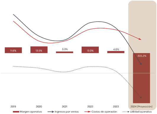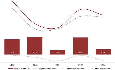 139. El margen operativo fue de 11.6% en 2019, 13.5% en 2020, 3.3% en 2021, 13% en 2022 y 4% en el periodo de examen, de tal forma que disminuyó 9.0 puntos porcentuales en el periodo de examen y 7.6 puntos porcentuales en el periodo analizado. A continuación, se presenta una gráfica que muestra la evolución de los resultados operativos de la rama de producción nacional por ventas en el mercado interno: