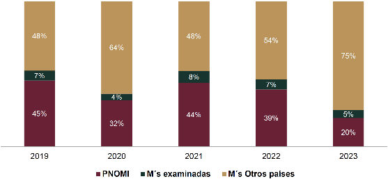 128. En relación con el mercado nacional, la PNOMI disminuyó su participación en el CNA al pasar de 45% en 2019 al 32%, 44%, 39% y 20% en 2020, 2021, 2022 y el periodo de examen, respectivamente. Ello representó una caída de 25 puntos porcentuales en el periodo analizado. Al respecto, la Secretaría observó que la pérdida de participación de la producción nacional se atribuye principalmente a las importaciones de otros orígenes, pues mientras las importaciones chinas redujeron su contribución en el periodo analizado al pasar del 7% en 2019 a 5% en el periodo examinado, las importaciones del resto de países aumentaron su contribución en el mercado en 27 puntos porcentuales al pasar del 48% al 75% en dicho lapso.