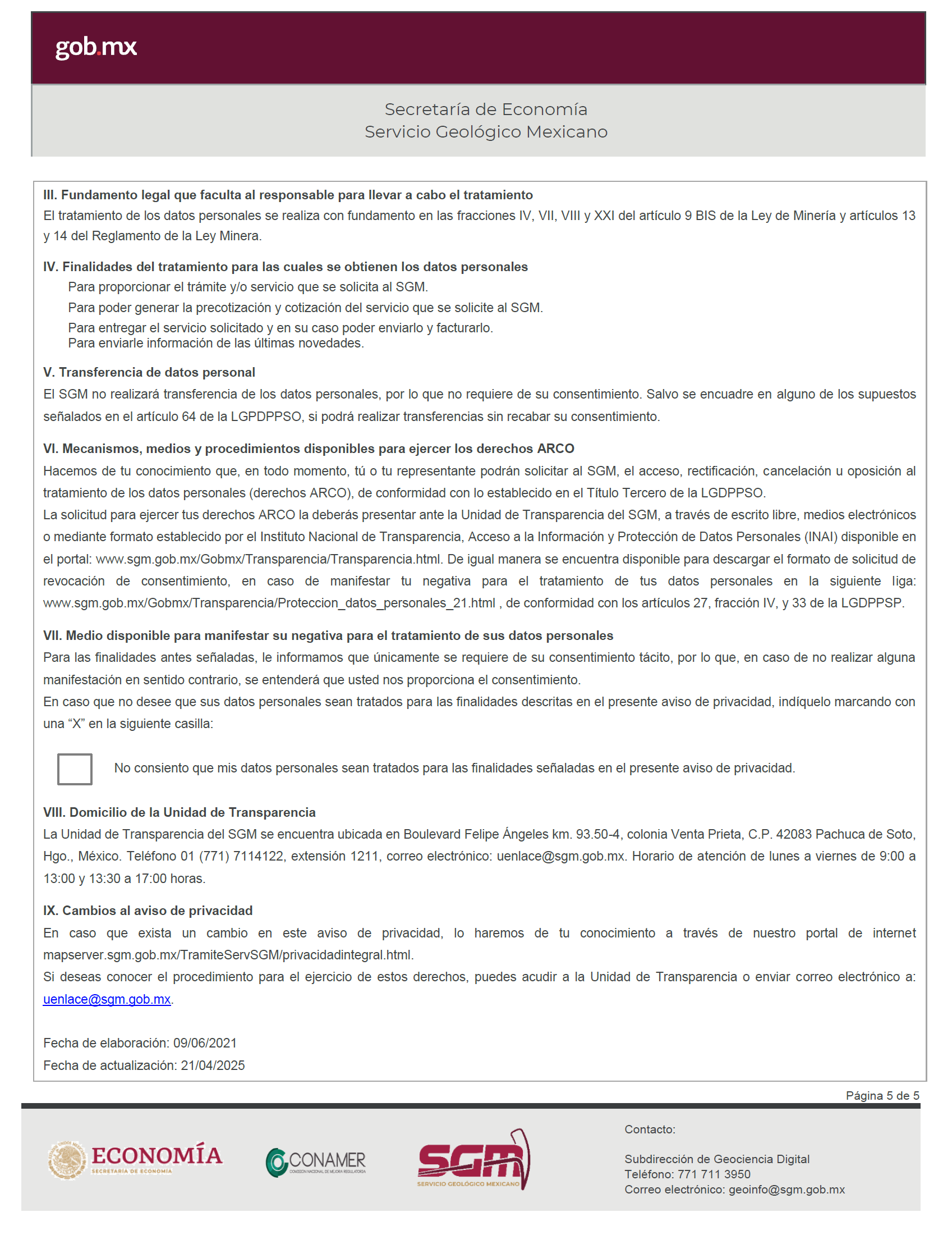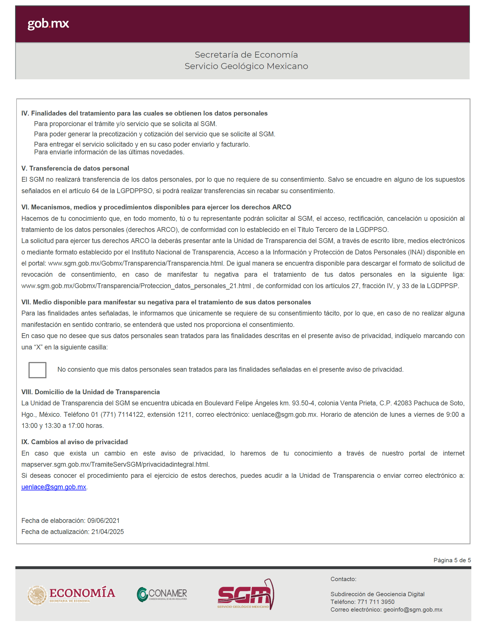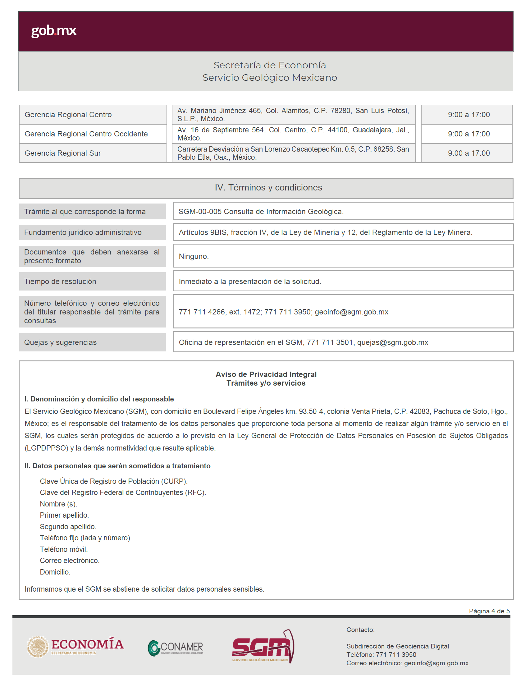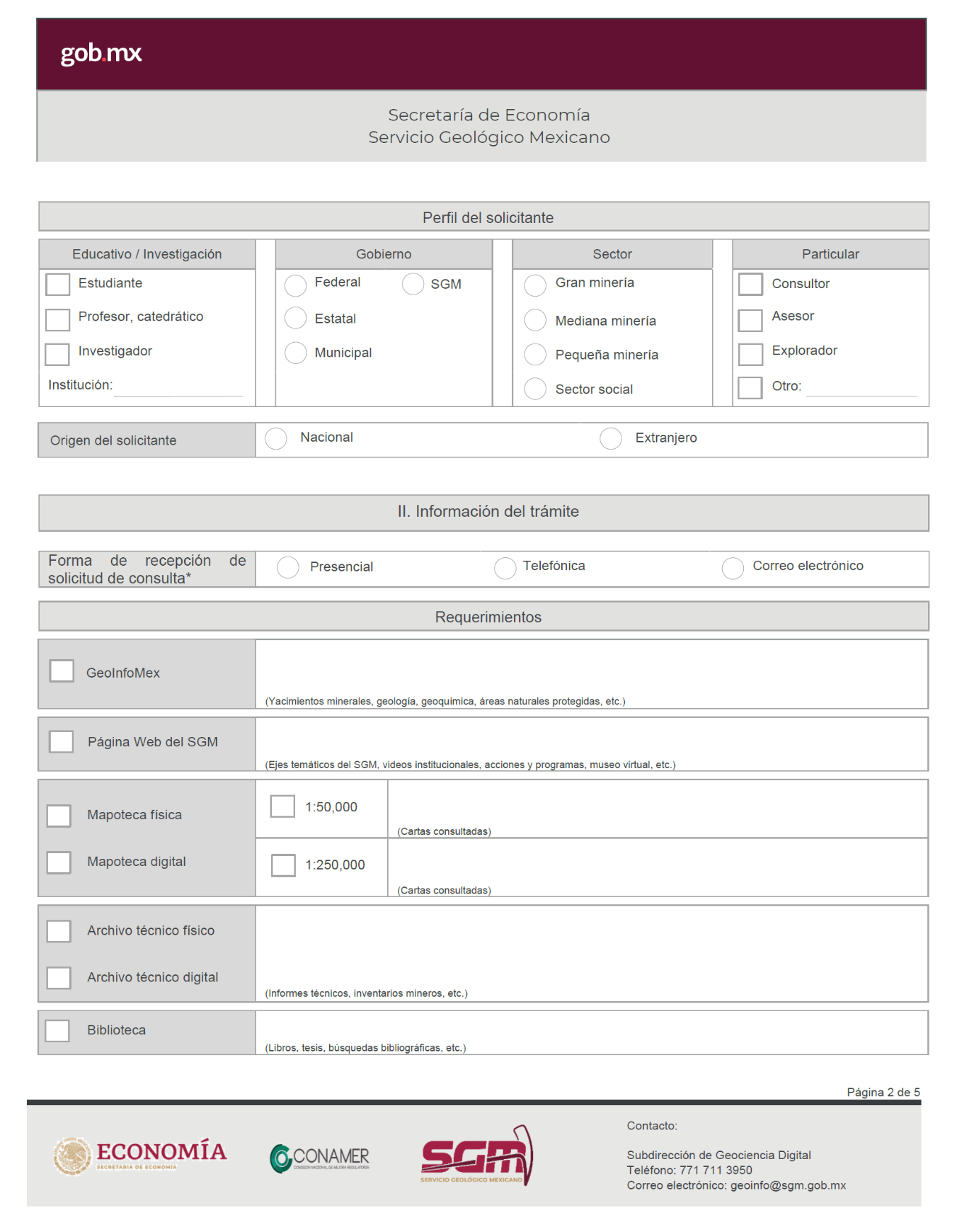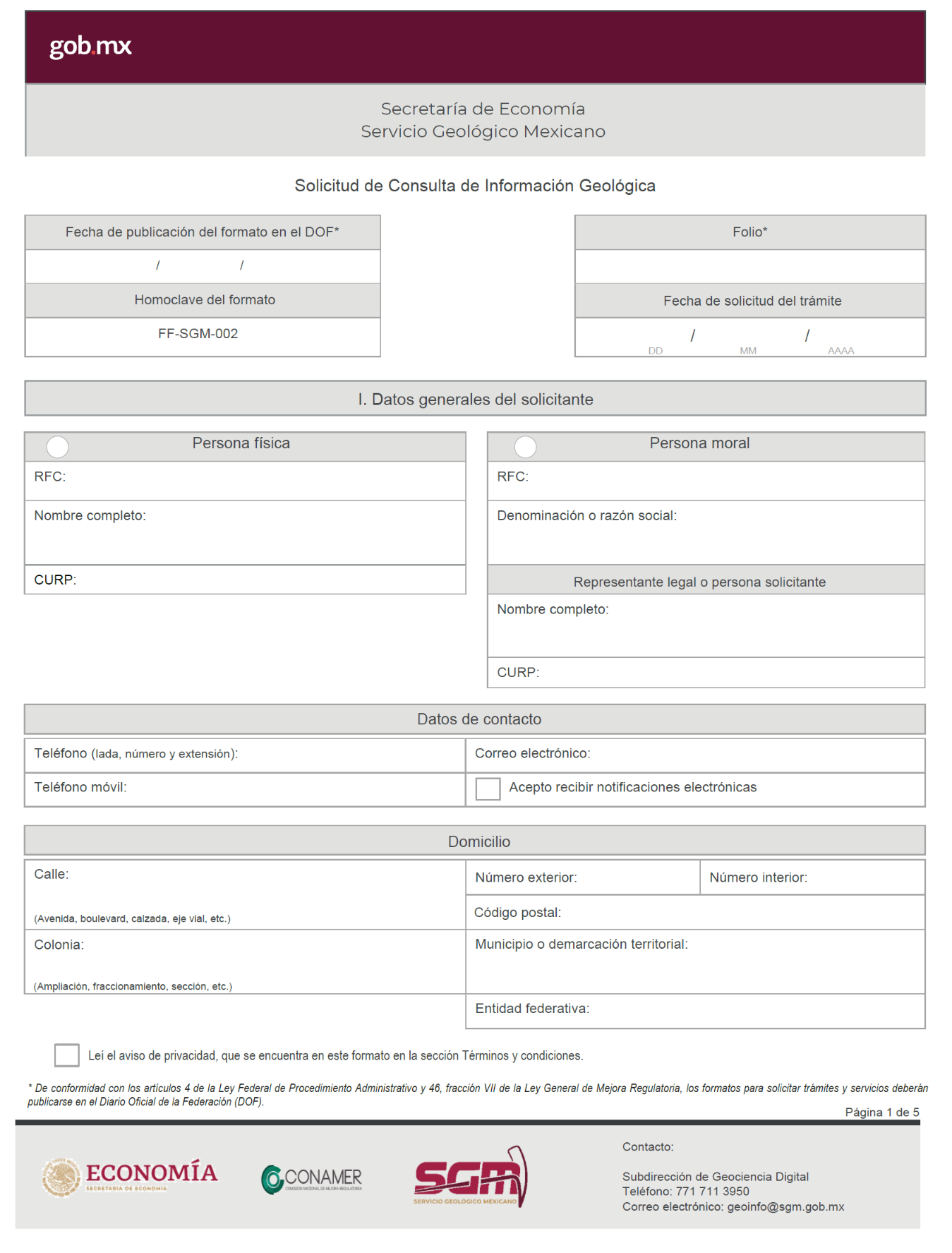ARTÍCULO NOVENO. Se establece el Formato con homoclave FF-SGM-002 para el servicio SGM-00-005 "Consulta de Información Geológica", mismo que se integra como ANEXO SEIS.