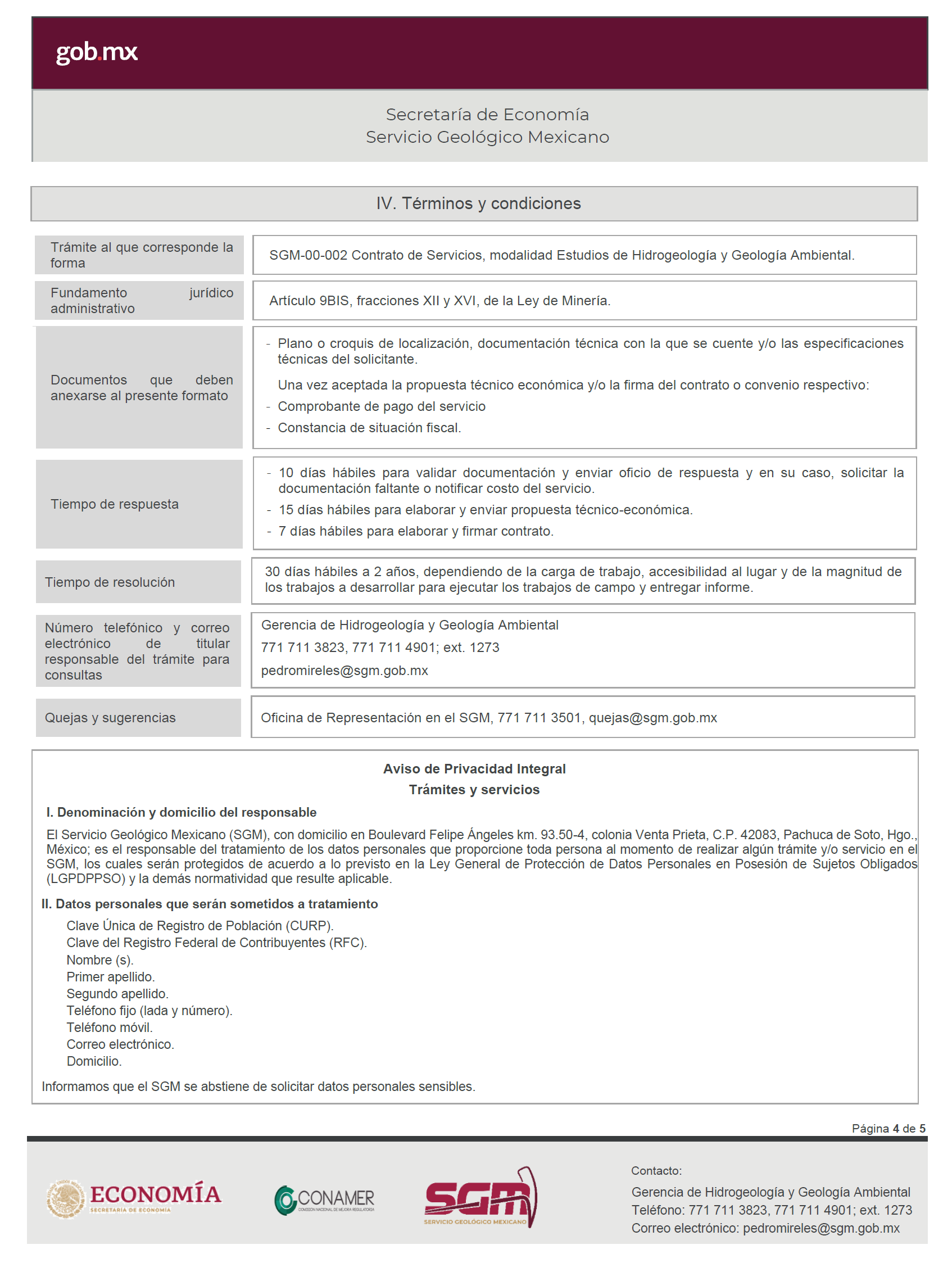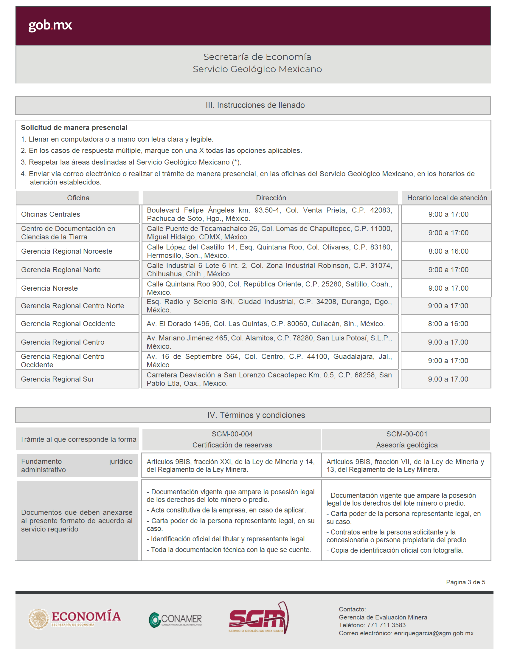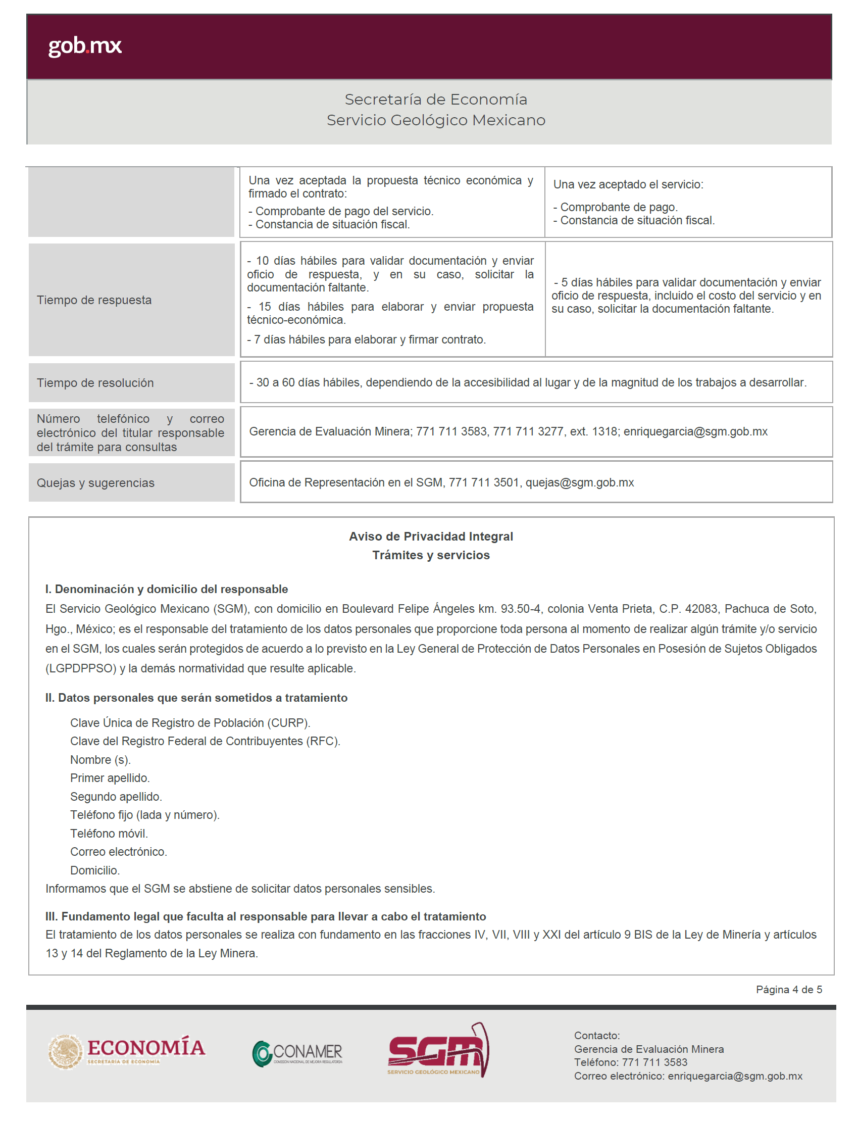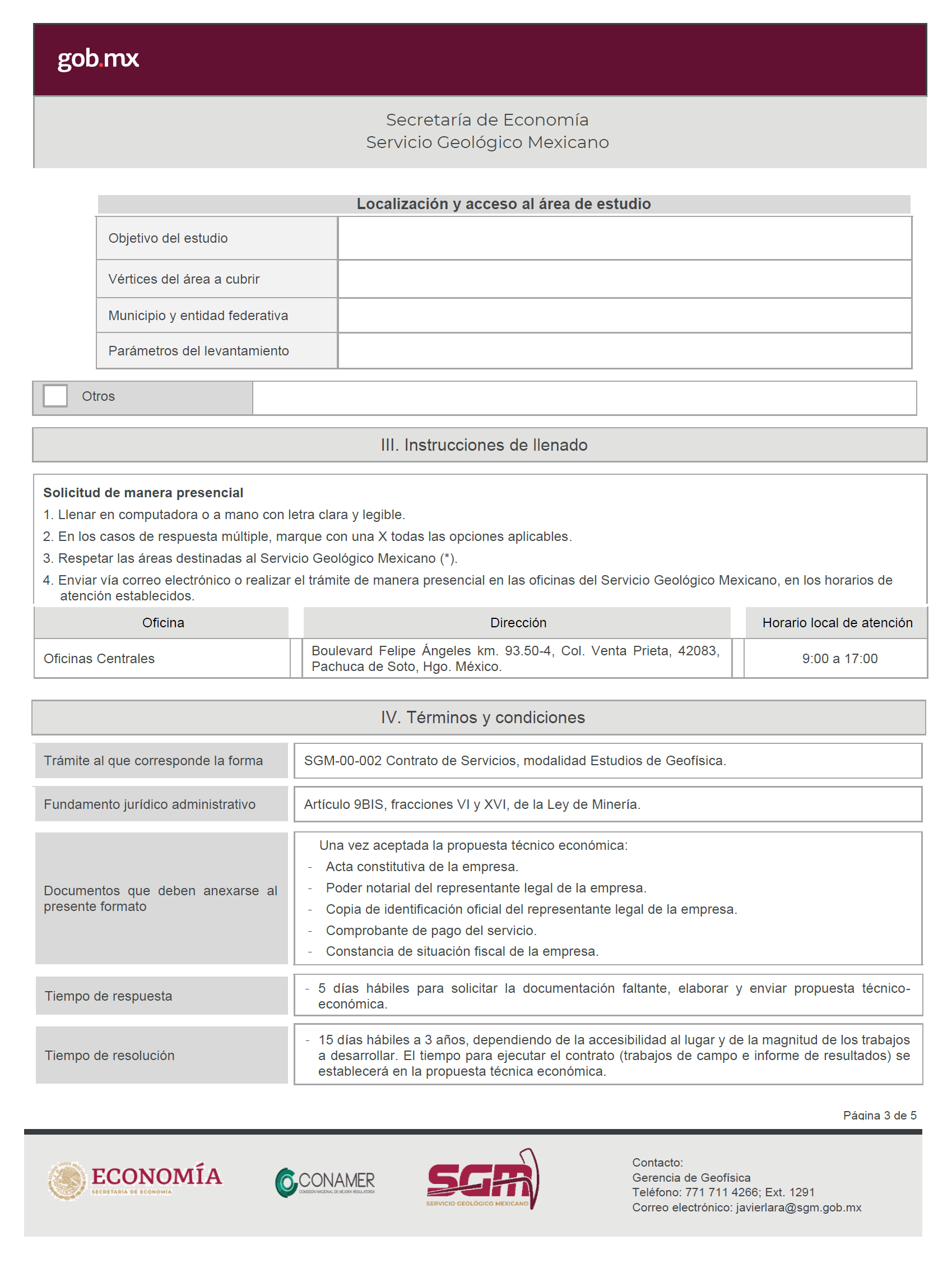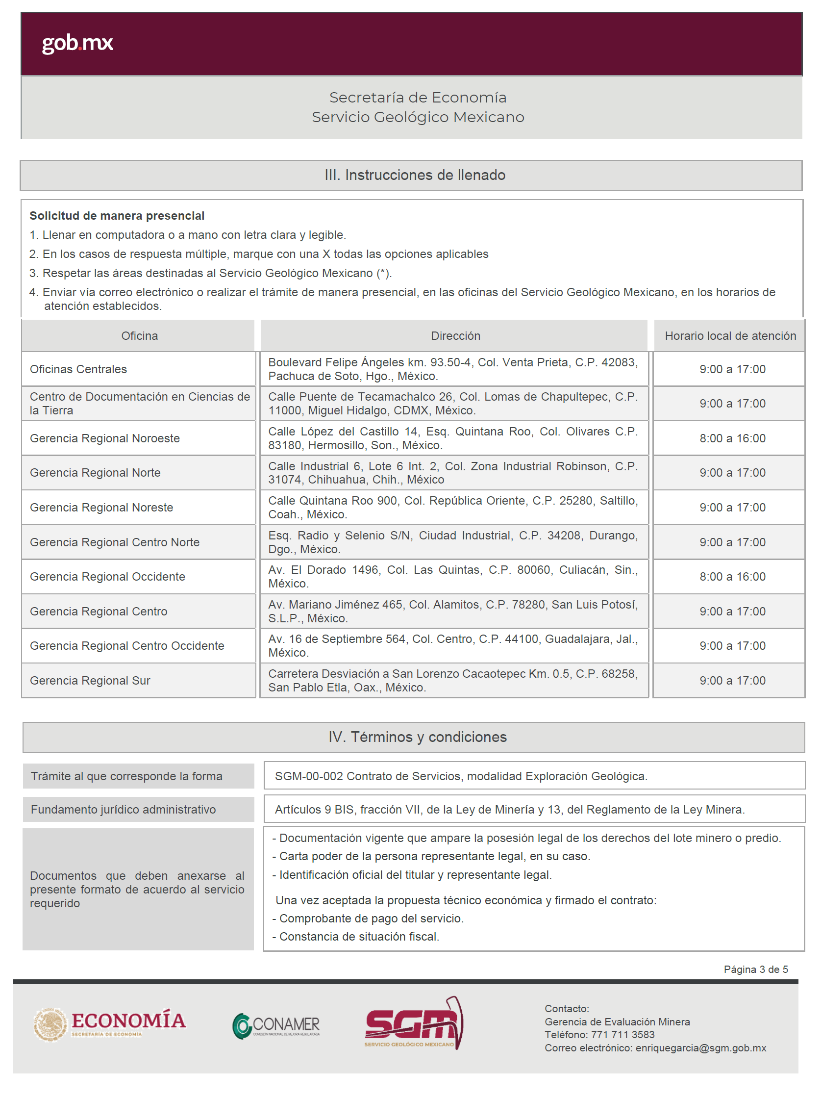 | 1 | SGM-00-002-A | Contrato de servicios. Modalidad: Exploración Geológica | Fusión de los servicios con homoclaves SGM-00-002-A, SGM-00-002-B y SGM-00-002-C en uno sólo para quedar como Contrato de servicios. Con las modalidades: A) Exploración Geológica. B) Estudios de Hidrogeología y Geología Ambiental C) Estudios de Geofísica. | Contrato de servicios. 1. Comprobante de pago del servicio. 2. Constancia de situación fiscal. A) Para Exploración Geológica se requerirá: 1. Formato "Solicitud de Contrato de Servicios. Modalidad A: Exploración Geológica". 2. Documentación vigente que ampare la posesión legal de los derechos del lote minero o predio. 3. Carta poder de la persona representante legal, en su caso. 4. Identificación oficial de la persona titular y representante legal. B) Para Estudios de Hidrogeología y Geología Ambiental se requerirá: 1. Formato "Solicitud de Contrato de Servicios. Modalidad B: Estudios de Hidrogeología y Geología Ambiental" 2. Plano o croquis de localización, documentación técnica con la que se cuente y/o las especificaciones técnicas del solicitante. C) Para Estudios de Geofísica se requerirá: 1. Formato "Solicitud de Contrato de Servicios. Modalidad C: Estudios de Geofísica" 2. Acta constitutiva de la empresa. 3. Poder notarial de la persona representante legal de la empresa. 4. Copia de identificación oficial de la persona representante legal de la empresa. |