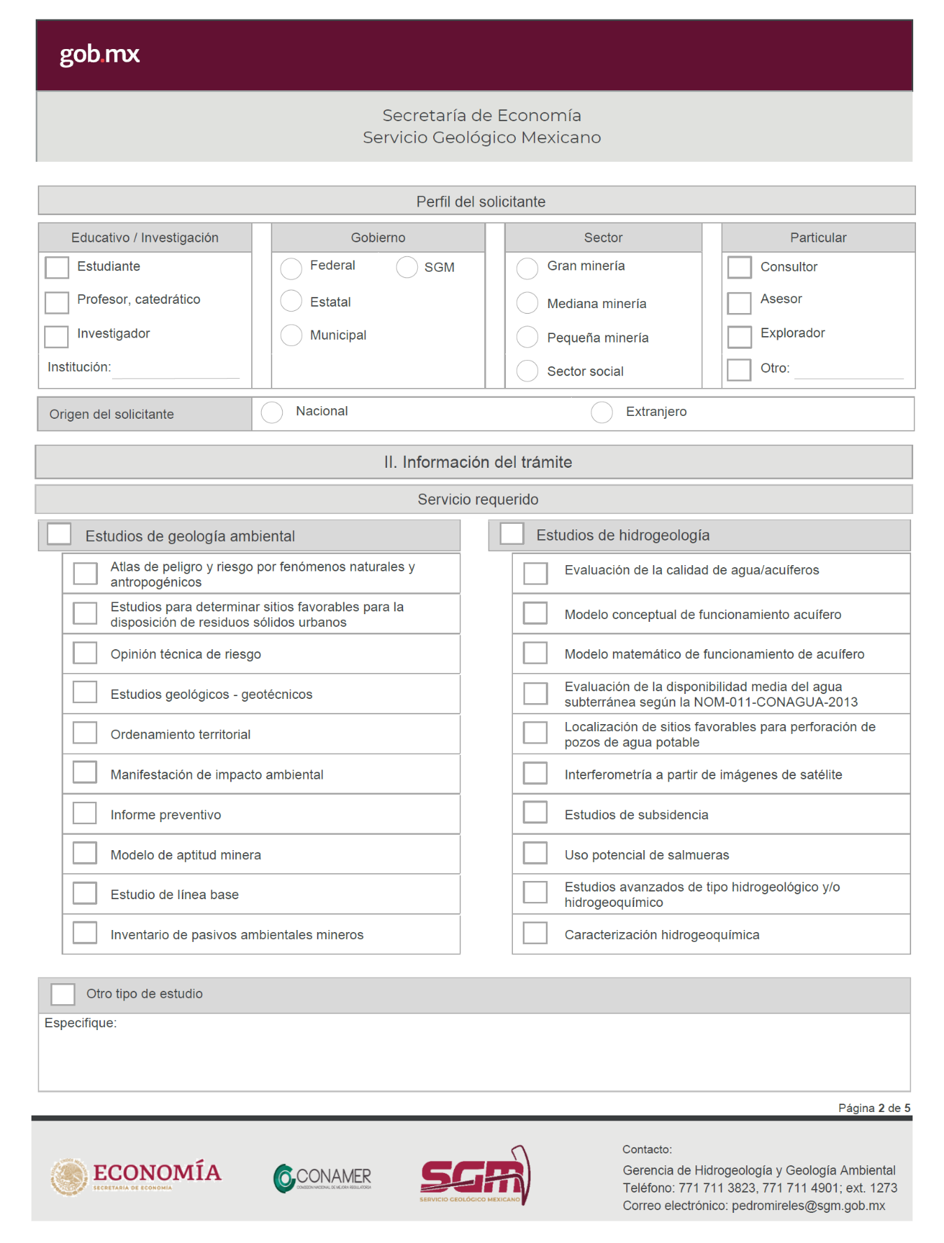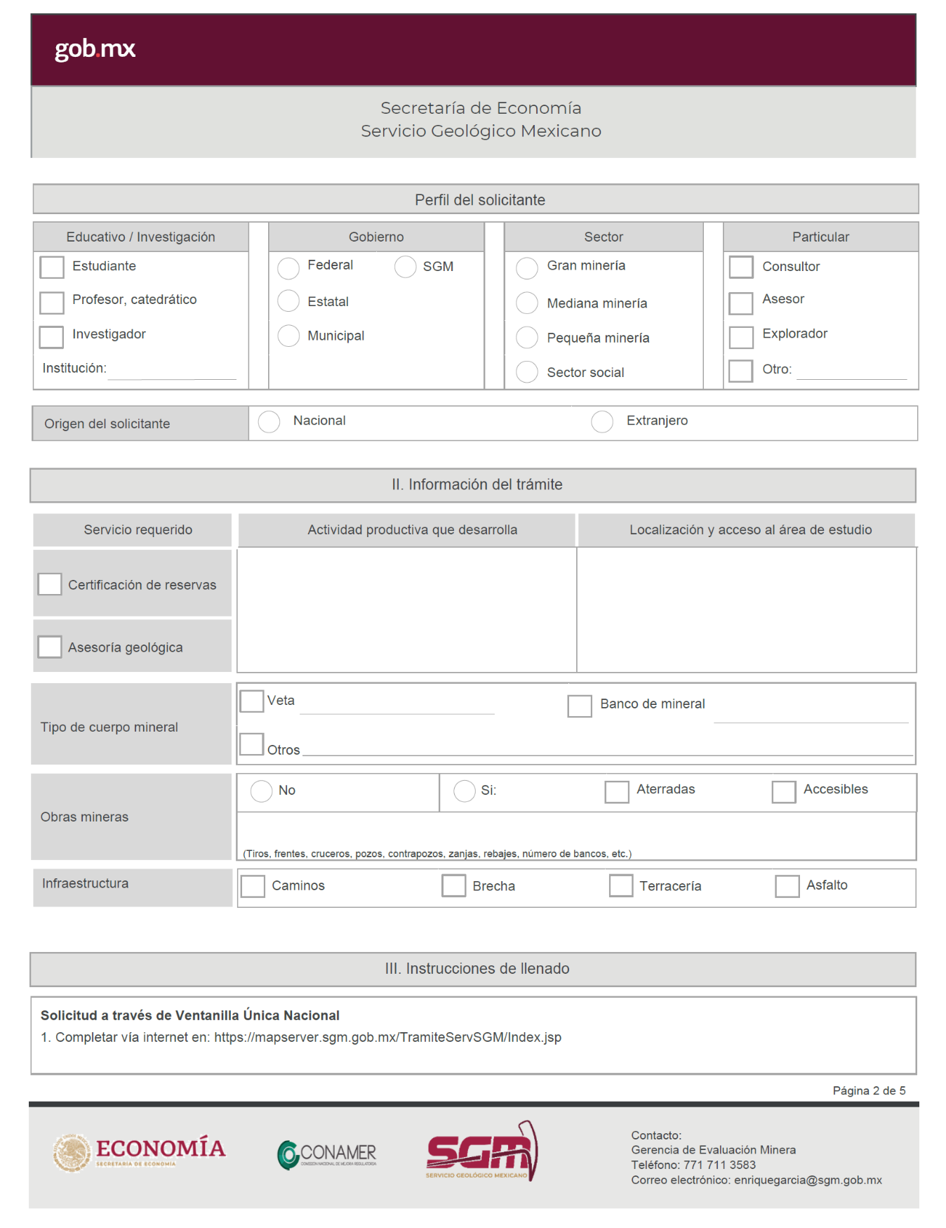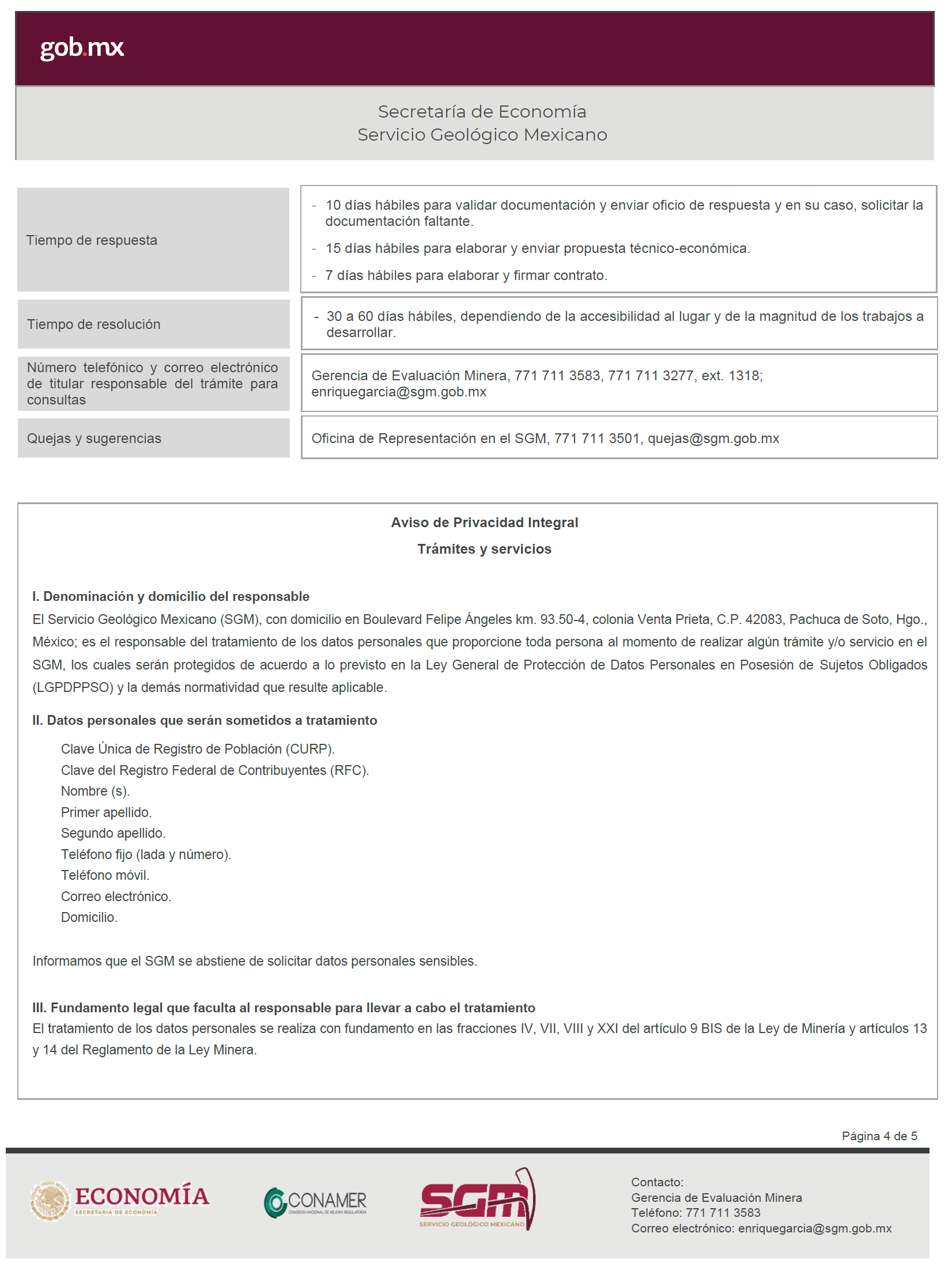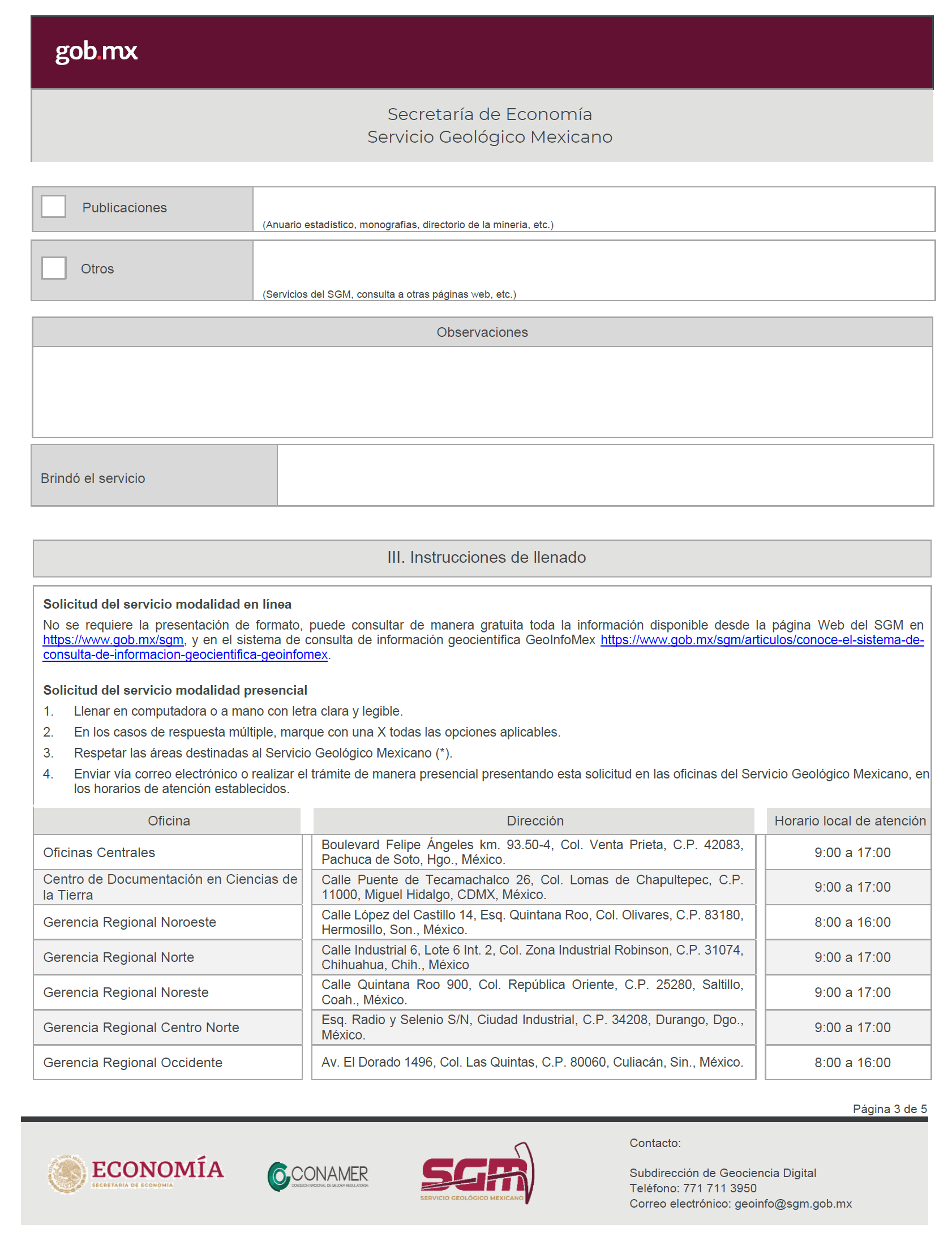 | 1 | SGM-00-002-A | Contrato de servicios. Modalidad: Exploración Geológica | Fusión de los servicios con homoclaves SGM-00-002-A, SGM-00-002-B y SGM-00-002-C en uno sólo para quedar como Contrato de servicios. Con las modalidades: A) Exploración Geológica. B) Estudios de Hidrogeología y Geología Ambiental C) Estudios de Geofísica. | Contrato de servicios. 1. Comprobante de pago del servicio. 2. Constancia de situación fiscal. A) Para Exploración Geológica se requerirá: 1. Formato "Solicitud de Contrato de Servicios. Modalidad A: Exploración Geológica". 2. Documentación vigente que ampare la posesión legal de los derechos del lote minero o predio. 3. Carta poder de la persona representante legal, en su caso. 4. Identificación oficial de la persona titular y representante legal. B) Para Estudios de Hidrogeología y Geología Ambiental se requerirá: 1. Formato "Solicitud de Contrato de Servicios. Modalidad B: Estudios de Hidrogeología y Geología Ambiental" 2. Plano o croquis de localización, documentación técnica con la que se cuente y/o las especificaciones técnicas del solicitante. C) Para Estudios de Geofísica se requerirá: 1. Formato "Solicitud de Contrato de Servicios. Modalidad C: Estudios de Geofísica" 2. Acta constitutiva de la empresa. 3. Poder notarial de la persona representante legal de la empresa. 4. Copia de identificación oficial de la persona representante legal de la empresa. |