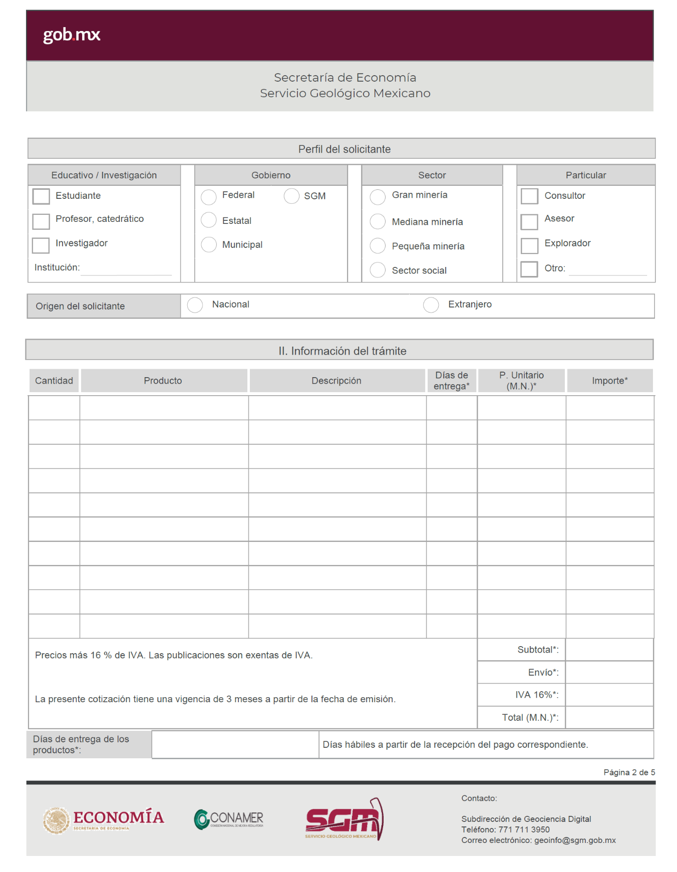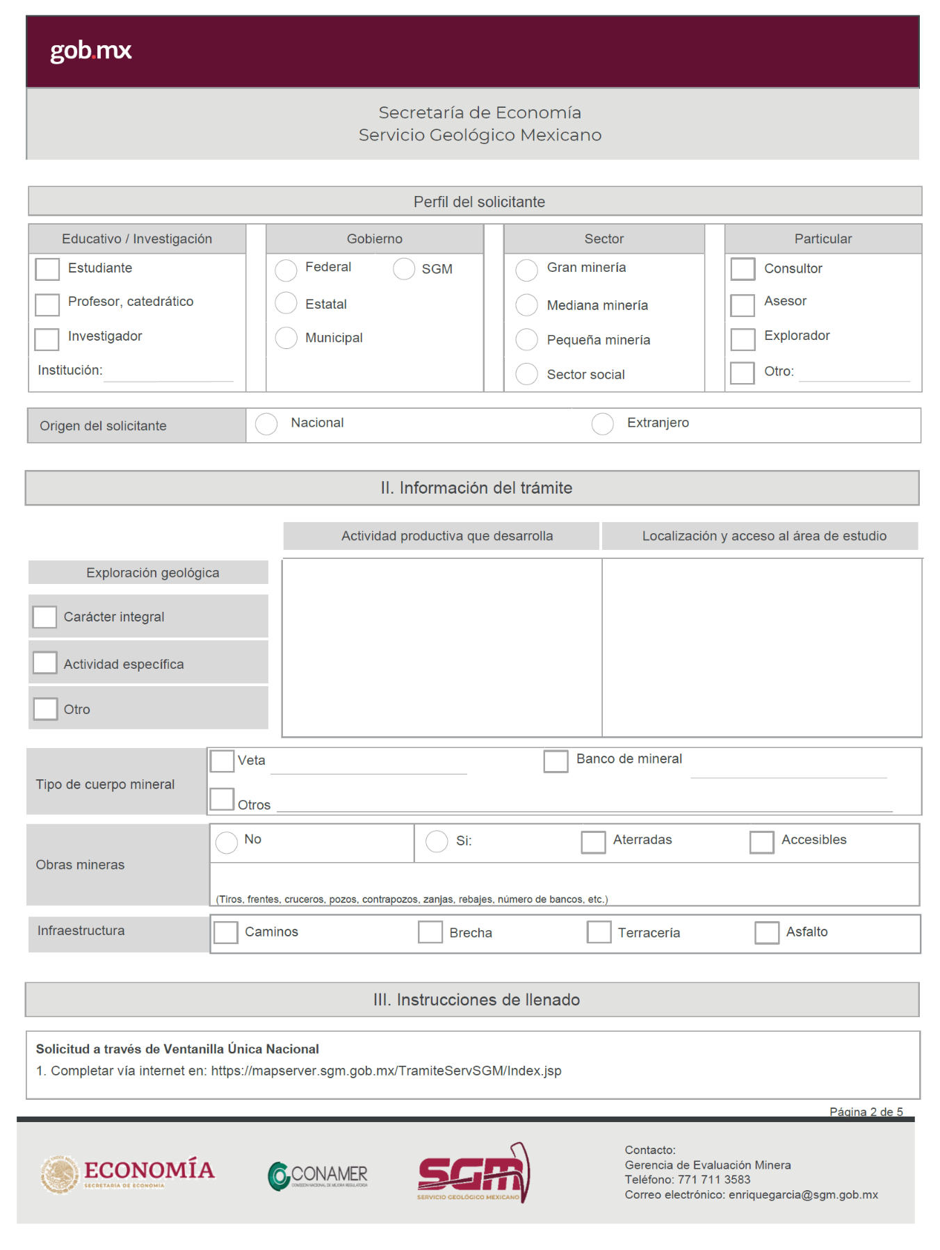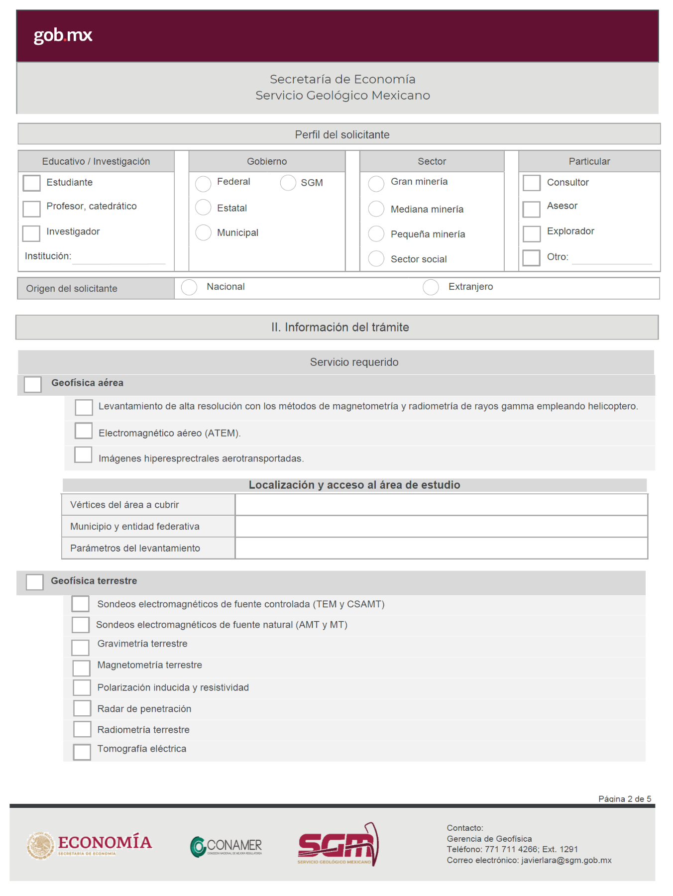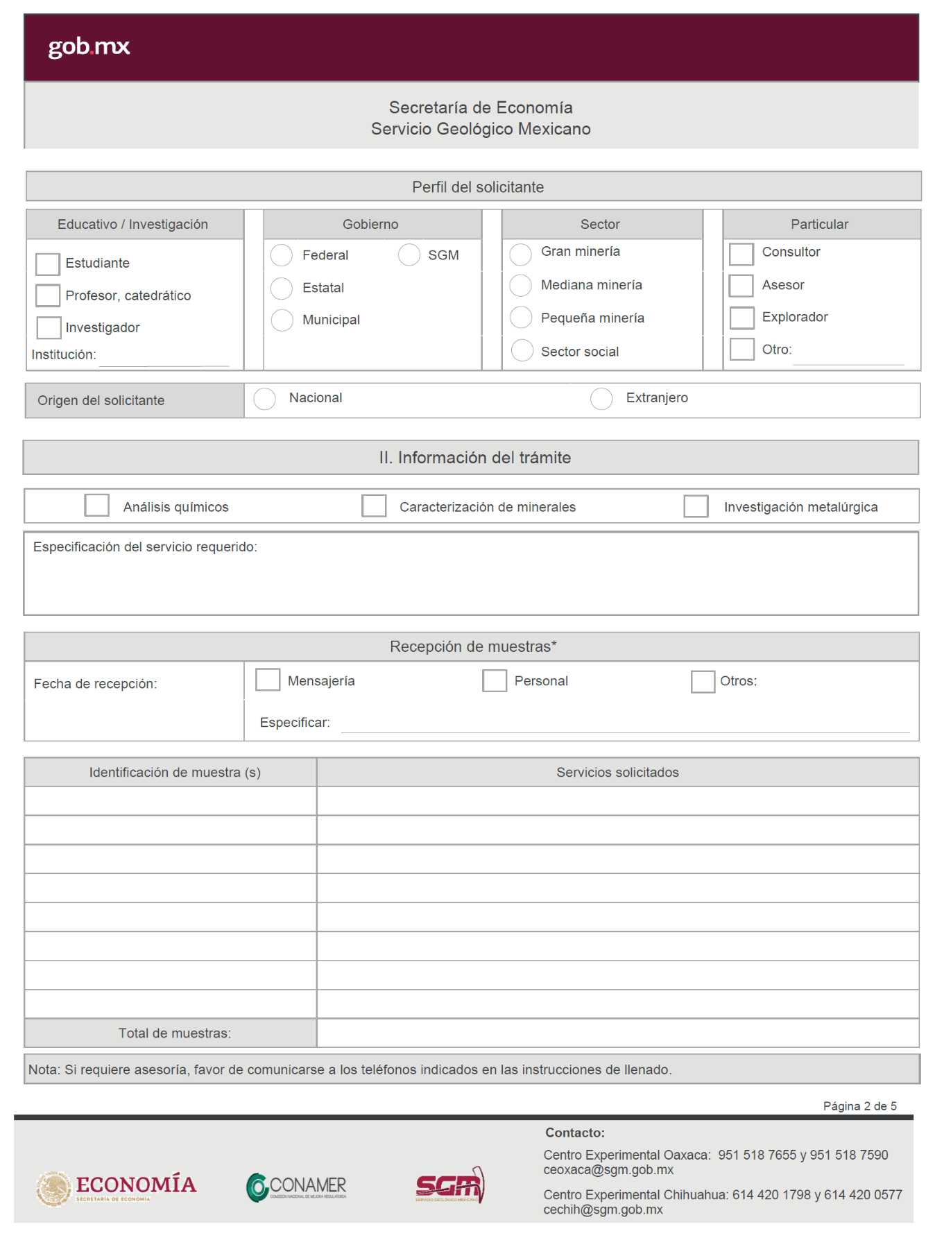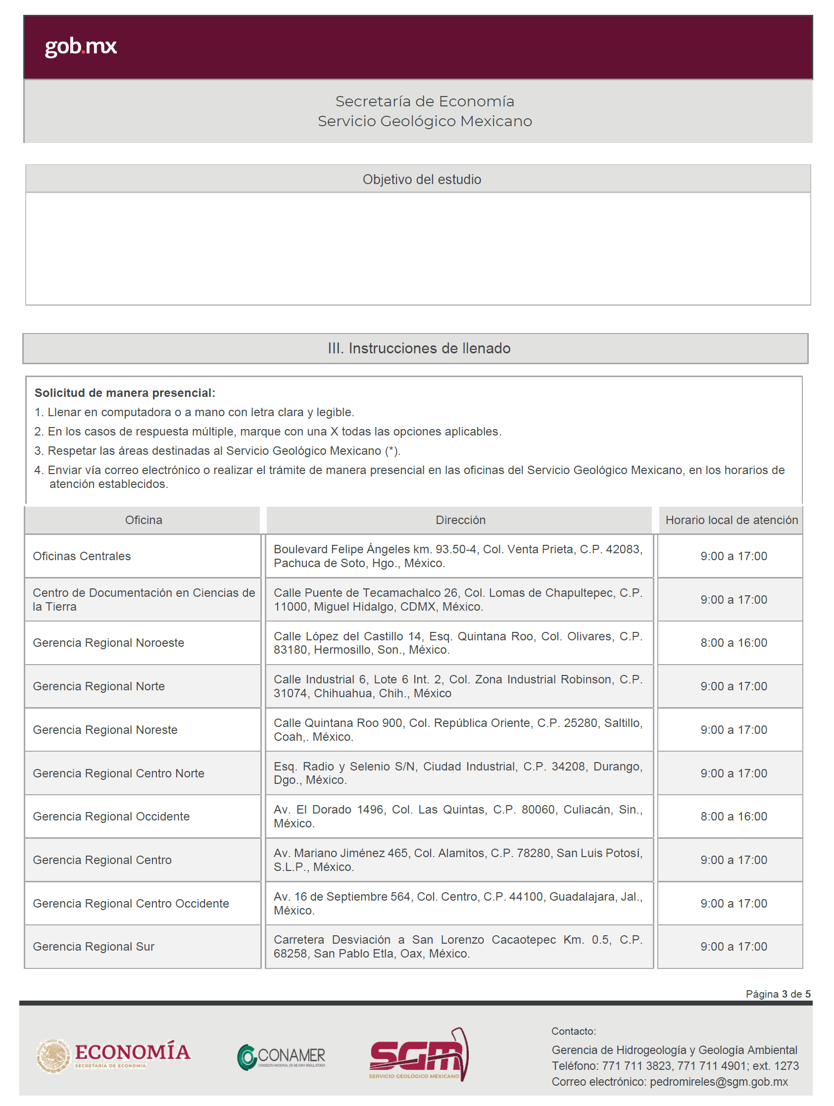 | 1 | SGM-00-002-A | Contrato de servicios. Modalidad: Exploración Geológica | Fusión de los servicios con homoclaves SGM-00-002-A, SGM-00-002-B y SGM-00-002-C en uno sólo para quedar como Contrato de servicios. Con las modalidades: A) Exploración Geológica. B) Estudios de Hidrogeología y Geología Ambiental C) Estudios de Geofísica. | Contrato de servicios. 1. Comprobante de pago del servicio. 2. Constancia de situación fiscal. A) Para Exploración Geológica se requerirá: 1. Formato "Solicitud de Contrato de Servicios. Modalidad A: Exploración Geológica". 2. Documentación vigente que ampare la posesión legal de los derechos del lote minero o predio. 3. Carta poder de la persona representante legal, en su caso. 4. Identificación oficial de la persona titular y representante legal. B) Para Estudios de Hidrogeología y Geología Ambiental se requerirá: 1. Formato "Solicitud de Contrato de Servicios. Modalidad B: Estudios de Hidrogeología y Geología Ambiental" 2. Plano o croquis de localización, documentación técnica con la que se cuente y/o las especificaciones técnicas del solicitante. C) Para Estudios de Geofísica se requerirá: 1. Formato "Solicitud de Contrato de Servicios. Modalidad C: Estudios de Geofísica" 2. Acta constitutiva de la empresa. 3. Poder notarial de la persona representante legal de la empresa. 4. Copia de identificación oficial de la persona representante legal de la empresa. |