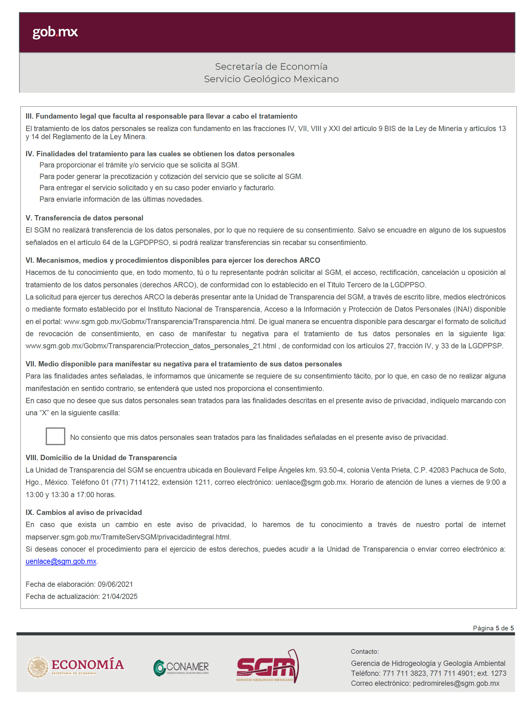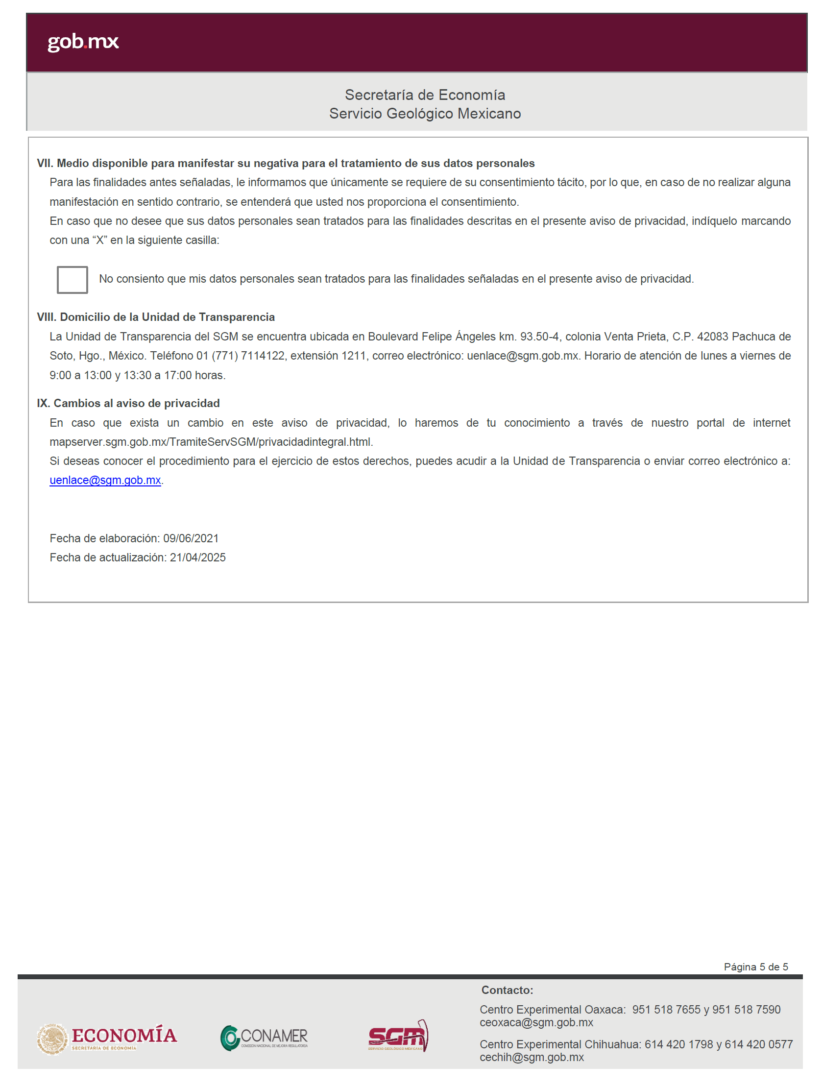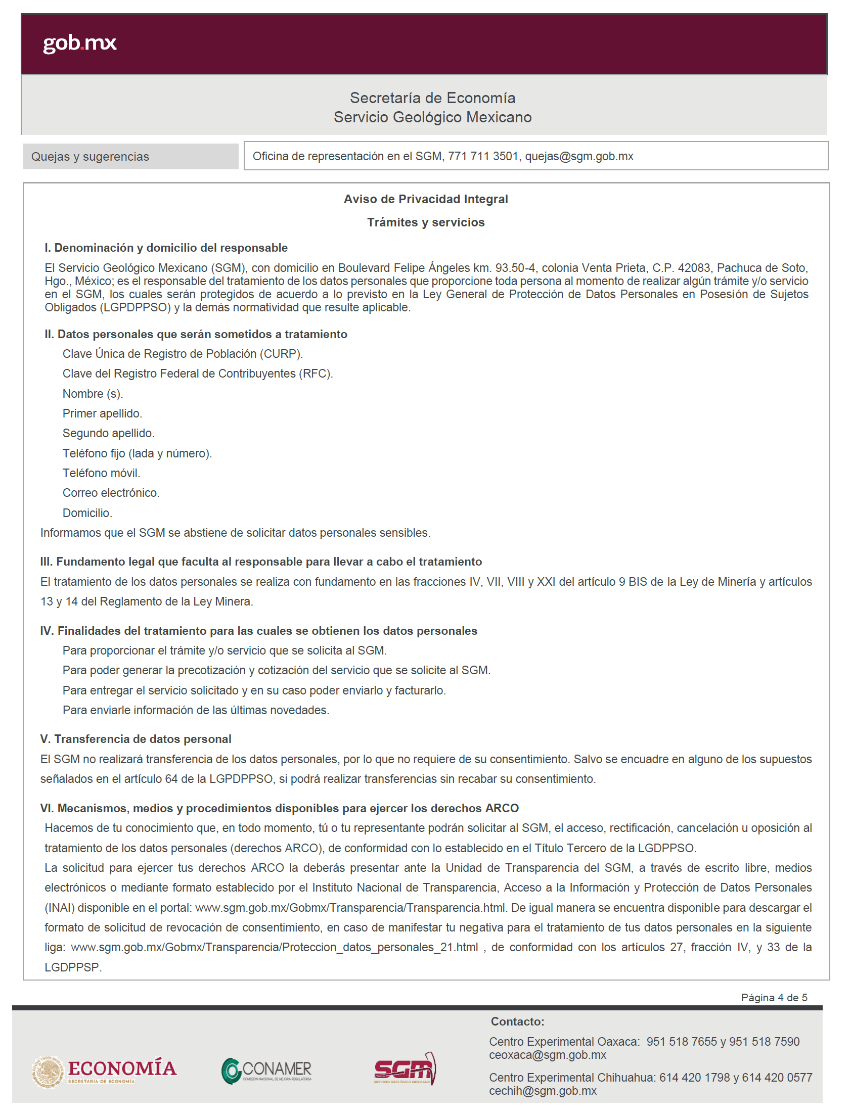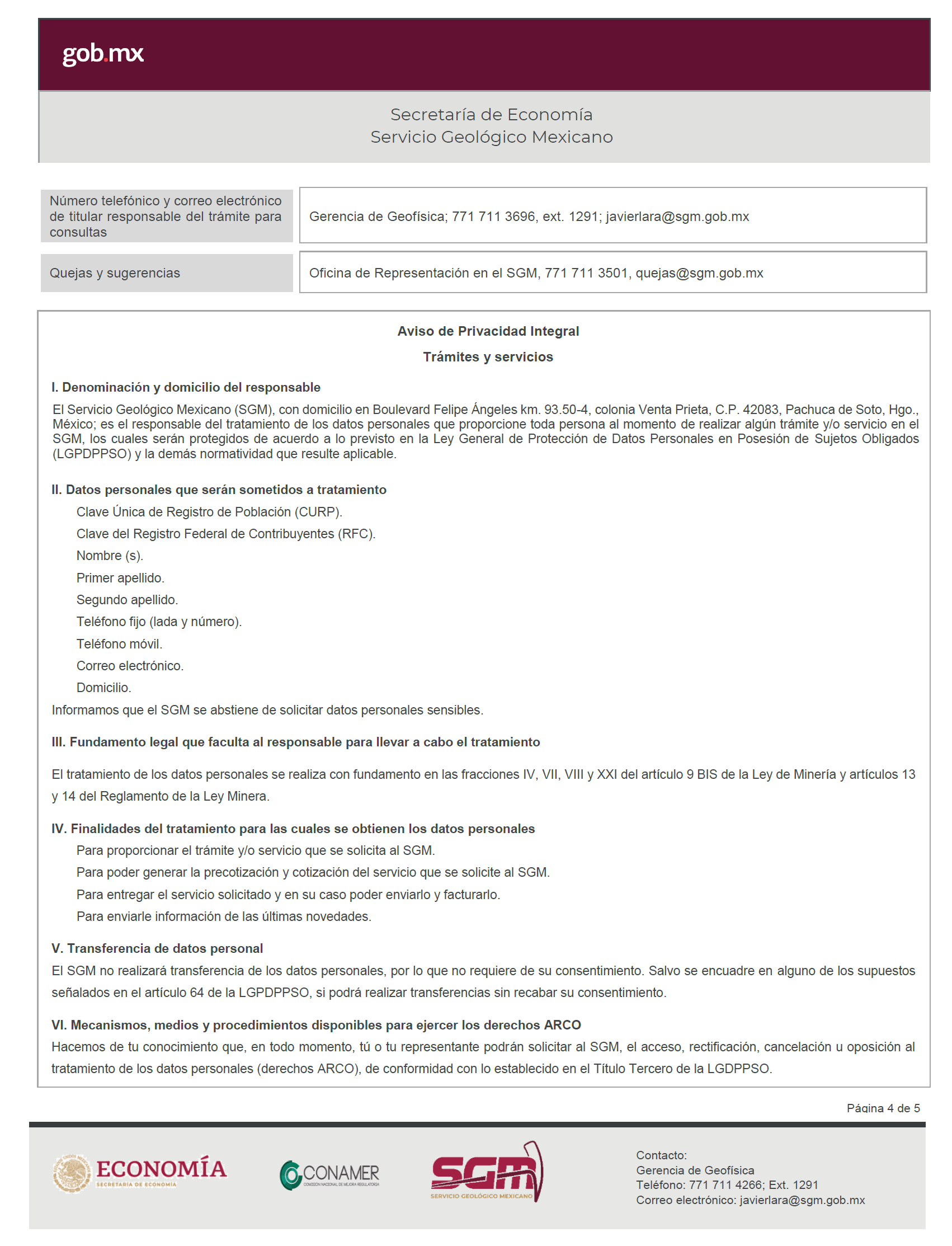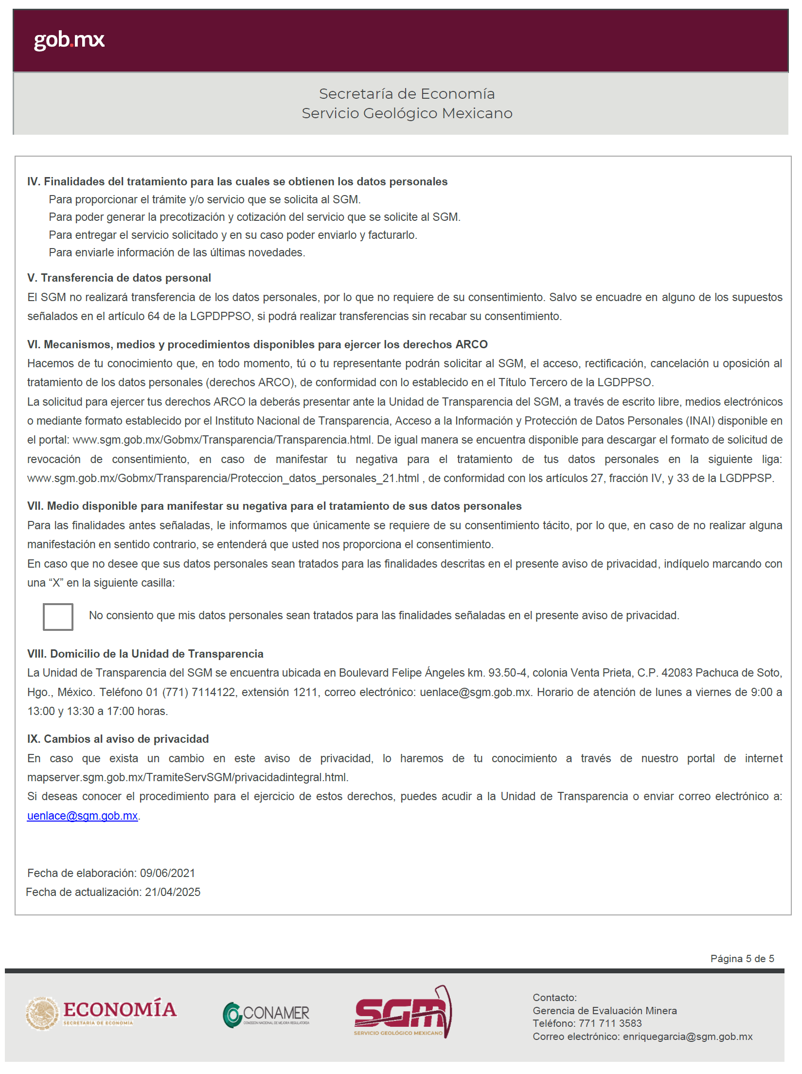 | 1 | SGM-00-002-A | Contrato de servicios. Modalidad: Exploración Geológica | Fusión de los servicios con homoclaves SGM-00-002-A, SGM-00-002-B y SGM-00-002-C en uno sólo para quedar como Contrato de servicios. Con las modalidades: A) Exploración Geológica. B) Estudios de Hidrogeología y Geología Ambiental C) Estudios de Geofísica. | Contrato de servicios. 1. Comprobante de pago del servicio. 2. Constancia de situación fiscal. A) Para Exploración Geológica se requerirá: 1. Formato "Solicitud de Contrato de Servicios. Modalidad A: Exploración Geológica". 2. Documentación vigente que ampare la posesión legal de los derechos del lote minero o predio. 3. Carta poder de la persona representante legal, en su caso. 4. Identificación oficial de la persona titular y representante legal. B) Para Estudios de Hidrogeología y Geología Ambiental se requerirá: 1. Formato "Solicitud de Contrato de Servicios. Modalidad B: Estudios de Hidrogeología y Geología Ambiental" 2. Plano o croquis de localización, documentación técnica con la que se cuente y/o las especificaciones técnicas del solicitante. C) Para Estudios de Geofísica se requerirá: 1. Formato "Solicitud de Contrato de Servicios. Modalidad C: Estudios de Geofísica" 2. Acta constitutiva de la empresa. 3. Poder notarial de la persona representante legal de la empresa. 4. Copia de identificación oficial de la persona representante legal de la empresa. |