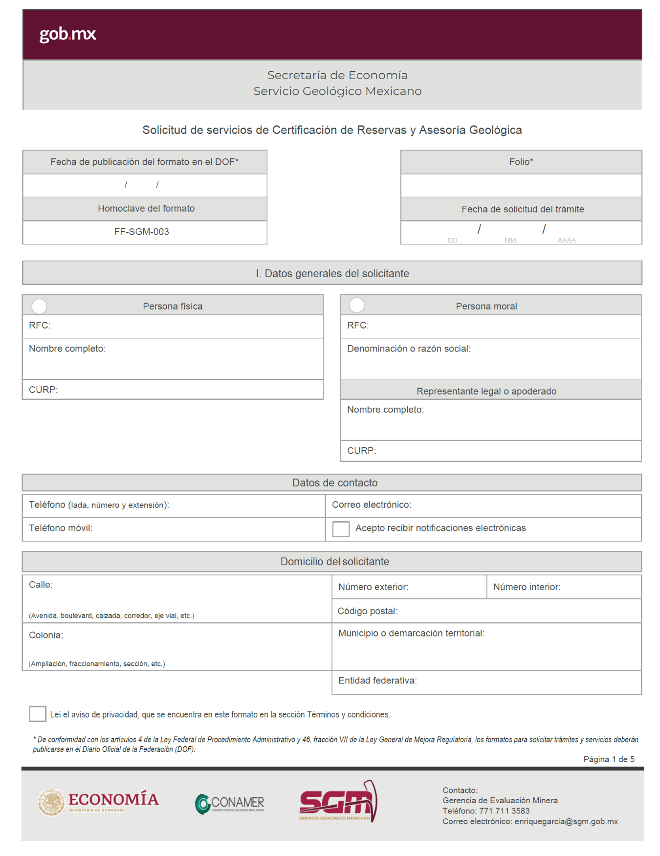 ARTÍCULO CUARTO. Se establece el Formato con homoclave FF-SGM-003 para los servicios SGM-00-001 "Certificación de Reservas" y SGM-00-004 "Asesoría Geológica", mismo que se integra como ANEXO UNO.