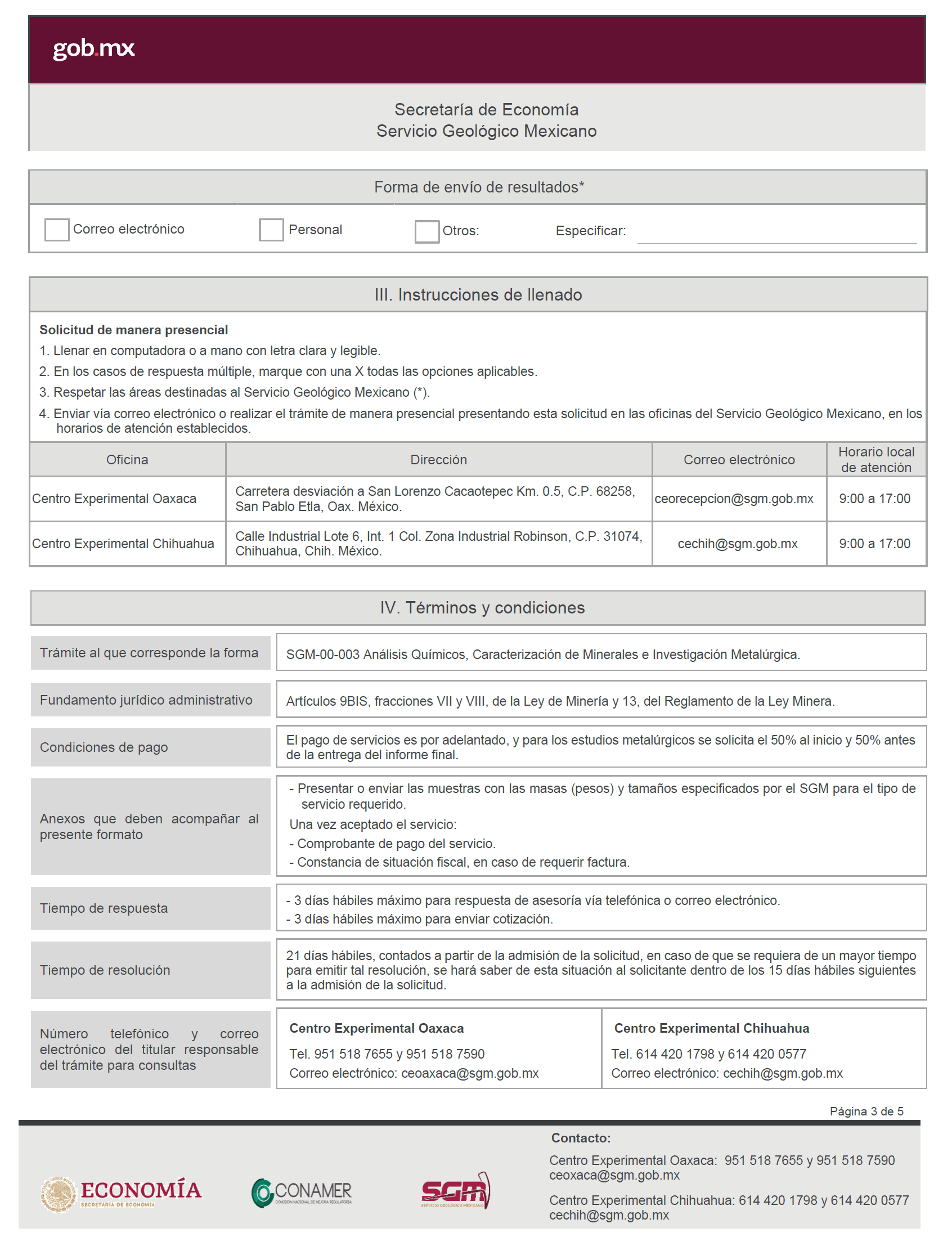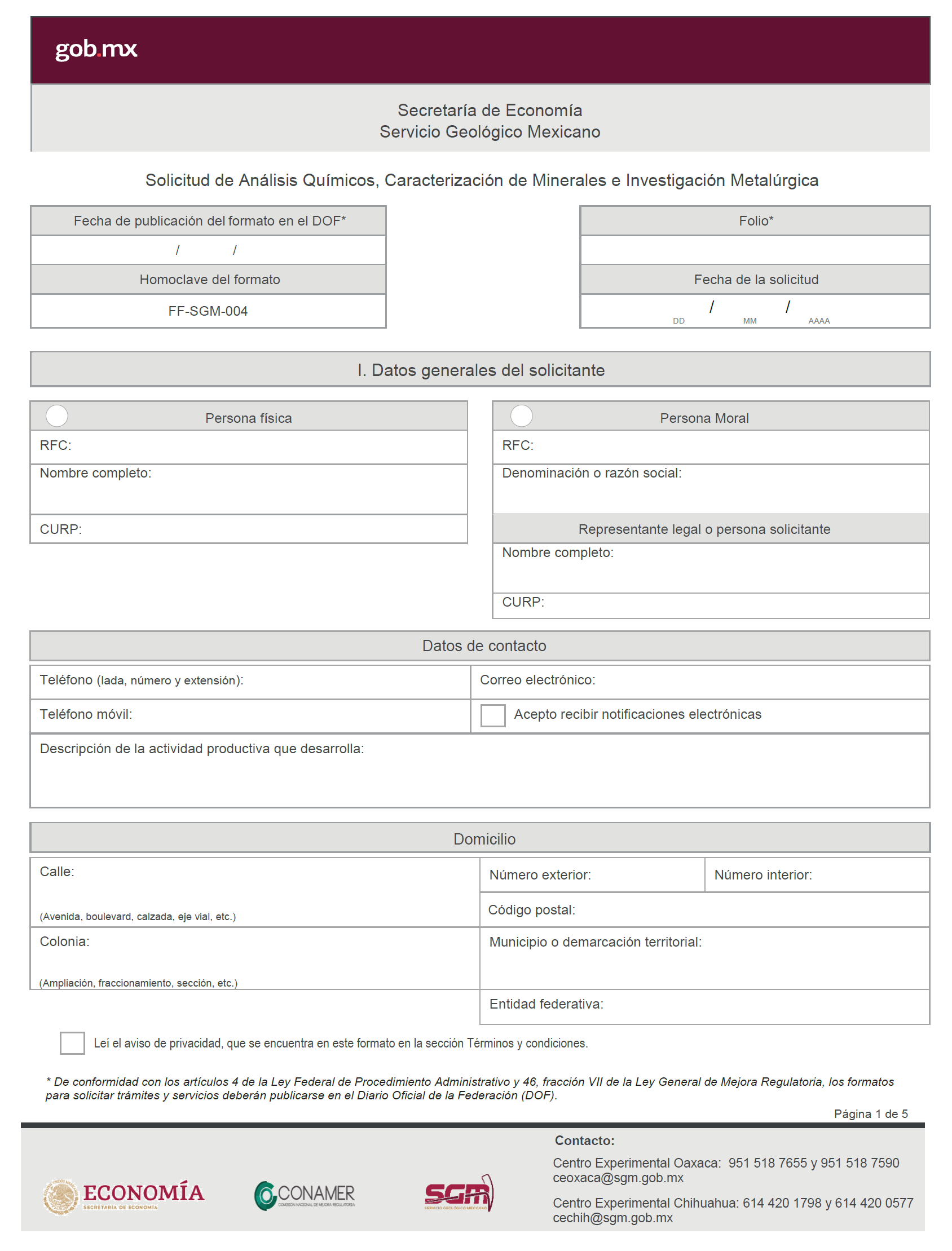 ARTÍCULO OCTAVO. Se establece el Formato con homoclave FF-SGM-004 para el servicio SGM-00-003 "Análisis Químicos, Caracterización de Minerales e investigación Metalúrgica", mismo que se integra como ANEXO CINCO.