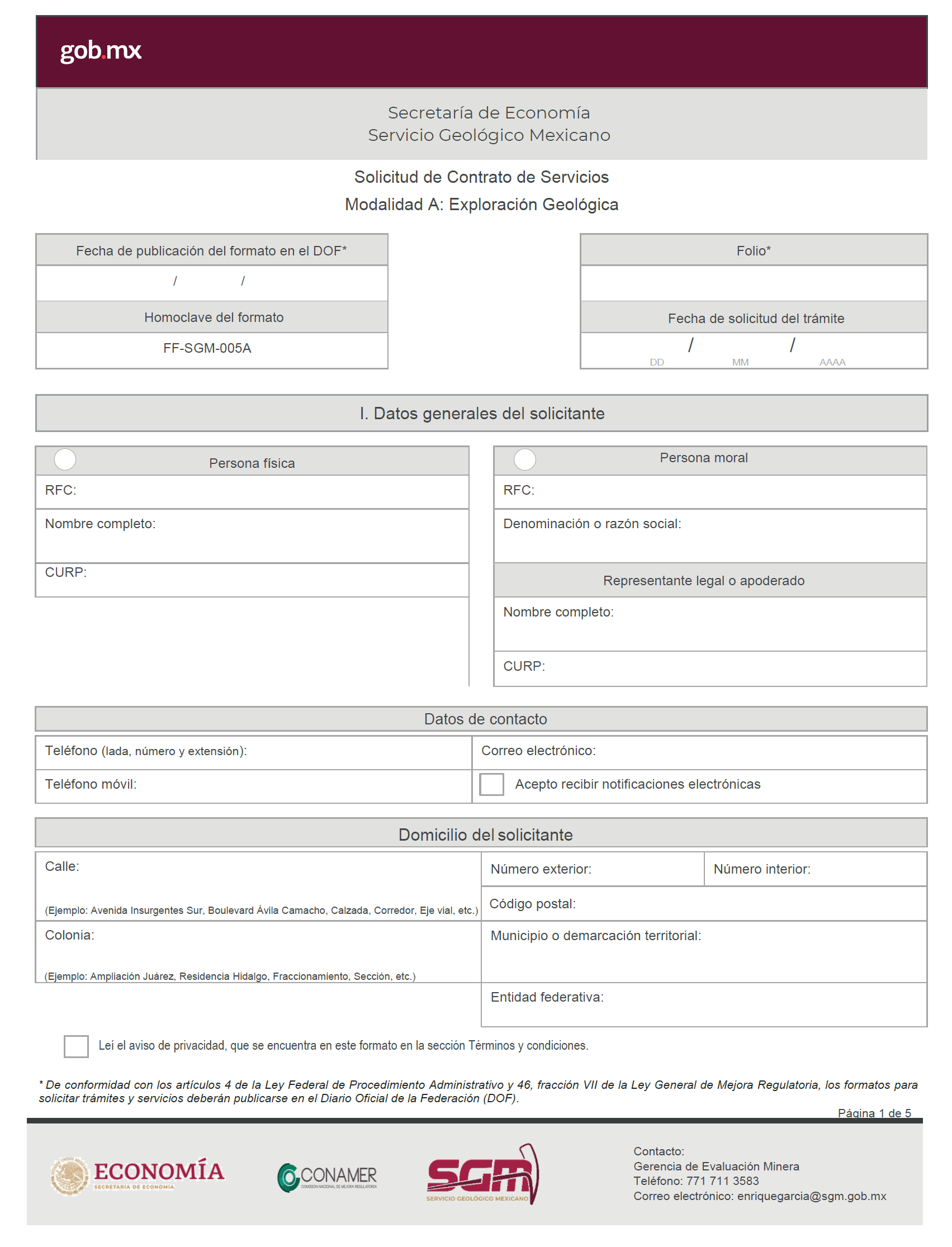 ARTÍCULO QUINTO. Se establece el Formato con homoclave FF-SGM-005A para el servicio SGM-00-002 "Contrato de servicios" en su modalidad A) "Exploración Geológica", mismo que se integra como ANEXO DOS.