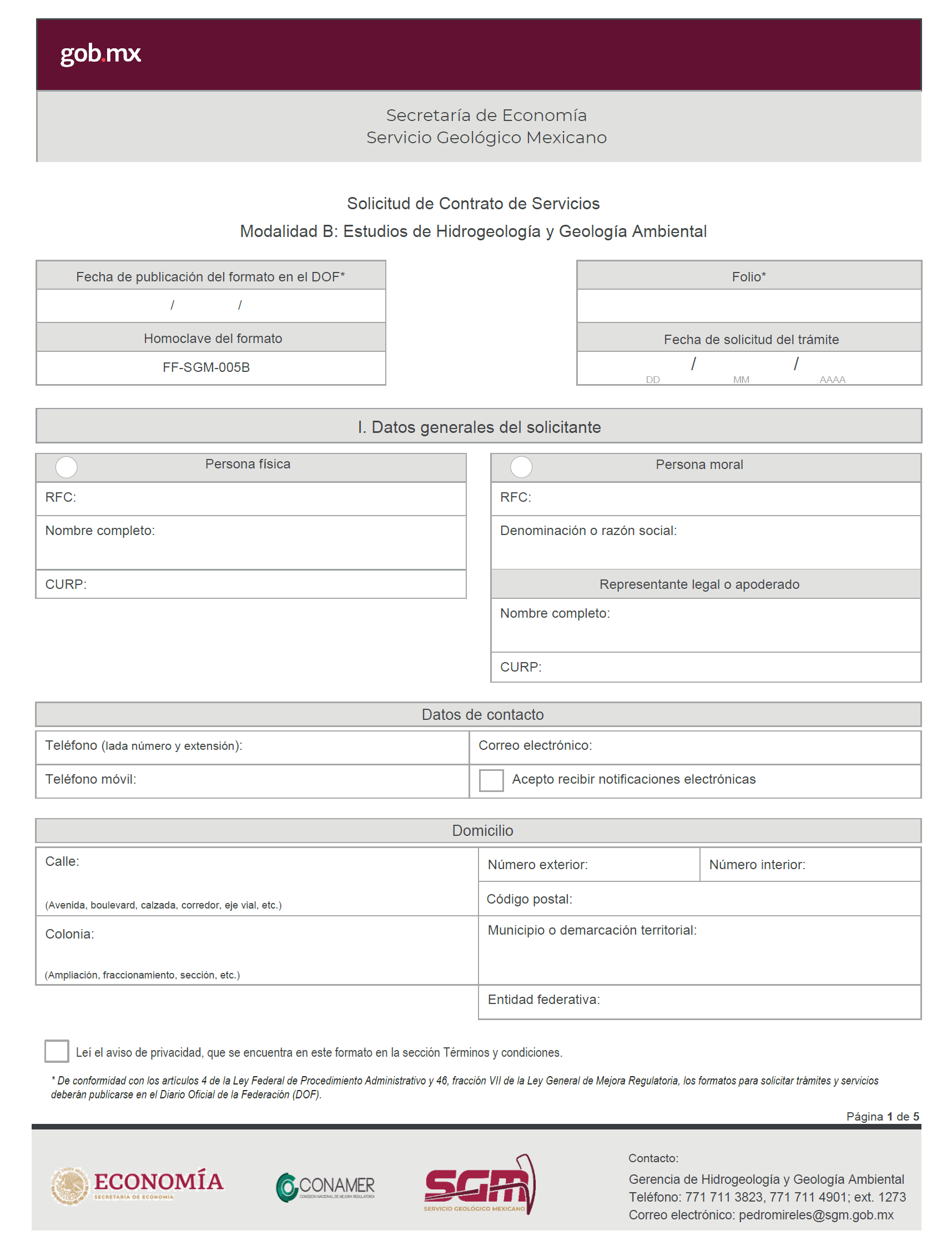 ARTÍCULO SEXTO. Se establece el Formato con homoclave FF-SGM-005B para el servicio SGM-00-002 "Contrato de servicios" en su modalidad B) "Estudios de Hidrogeología y Geología Ambiental", mismo que se integra como ANEXO TRES.